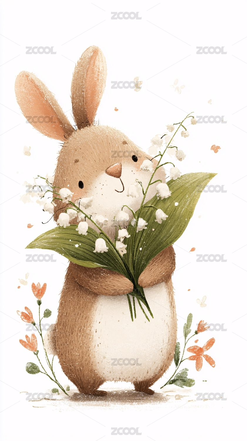 抱铃兰花的可爱兔子插画