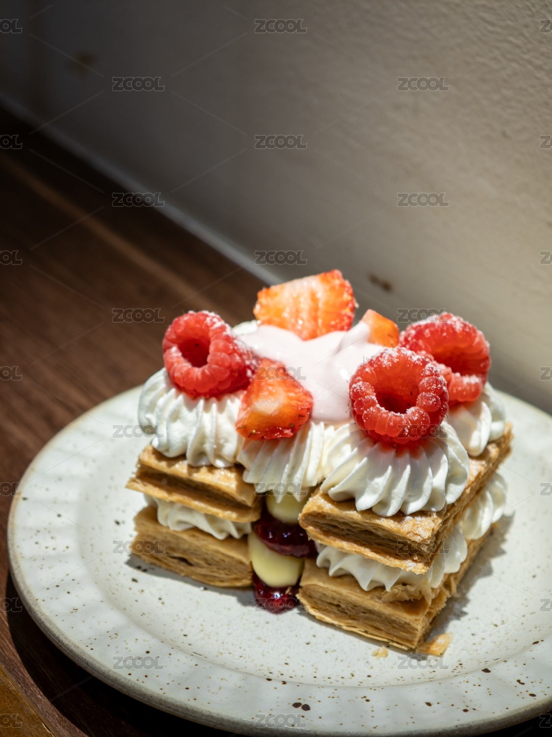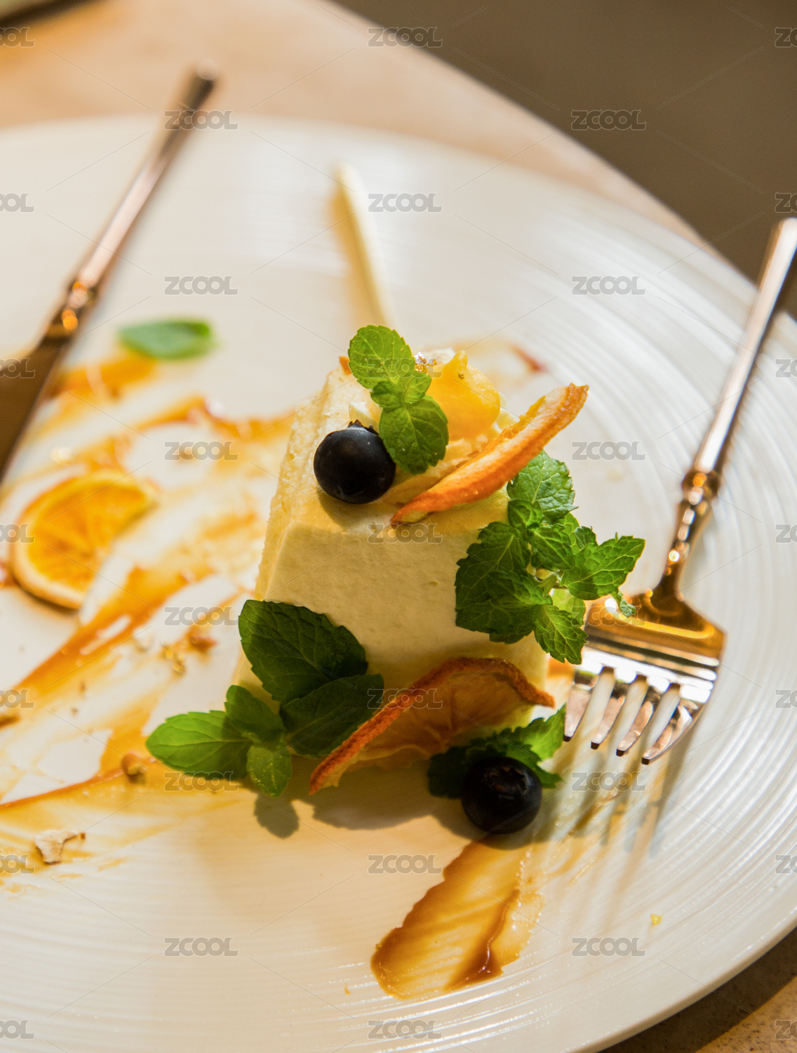一块点缀有草莓酱和蓝莓的芝士蛋糕