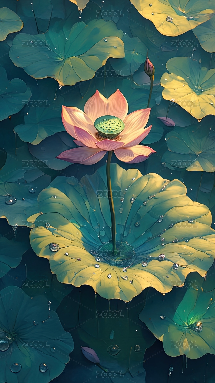 夏天清新的荷塘与荷花,日本浮世绘艺术