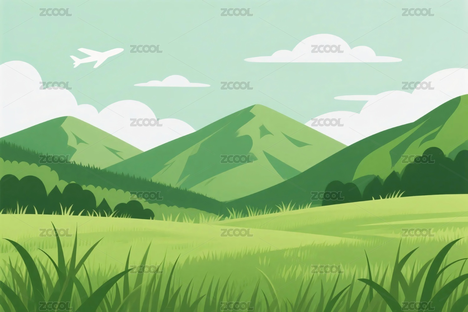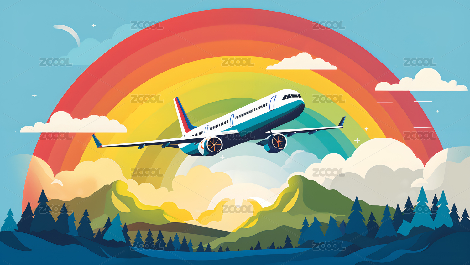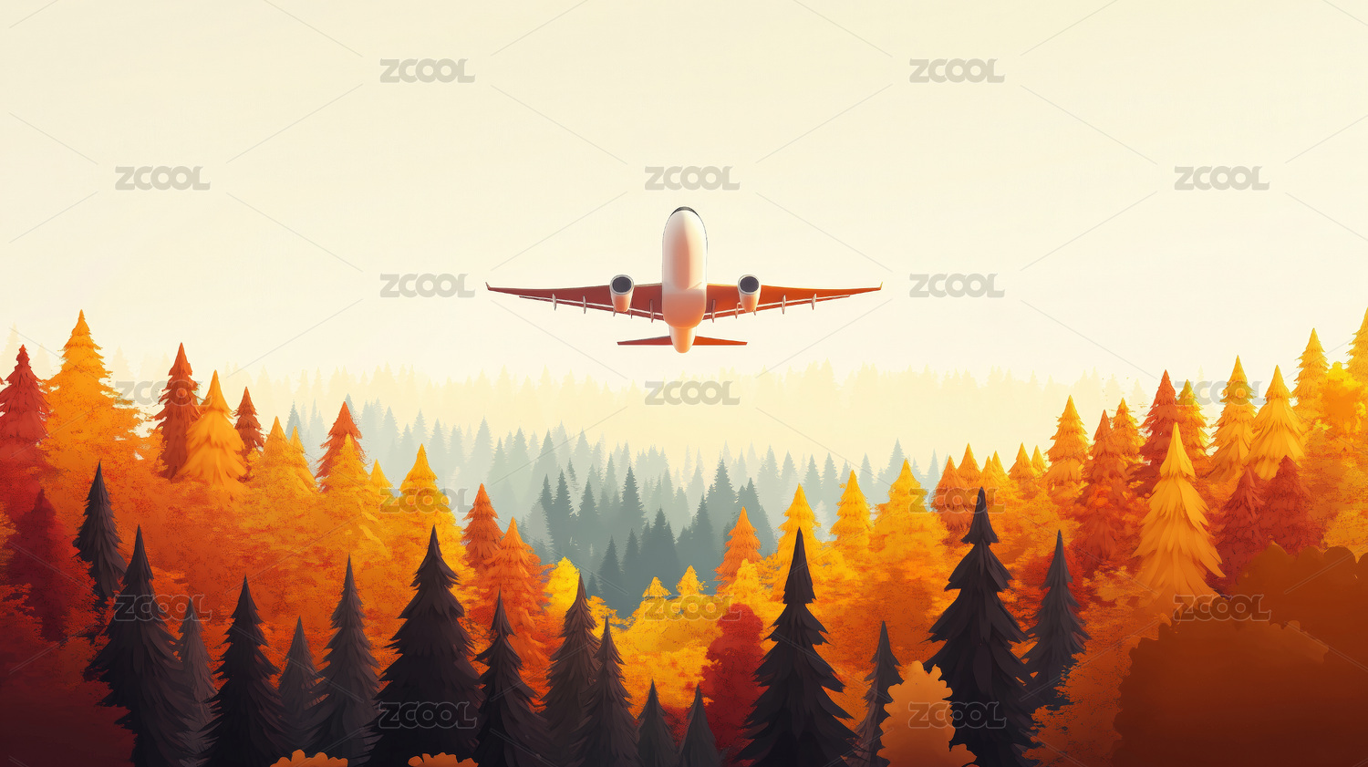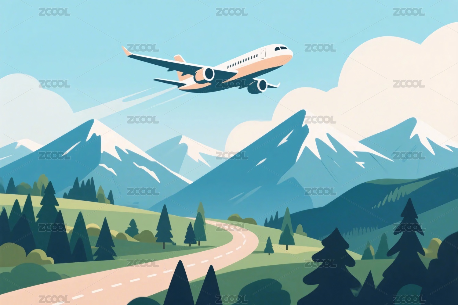 飞机,山脉,森林,道路,天空,云朵,风景,自然,插画,扁平