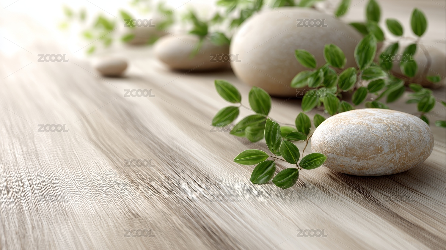 木质背景上的石头与绿叶