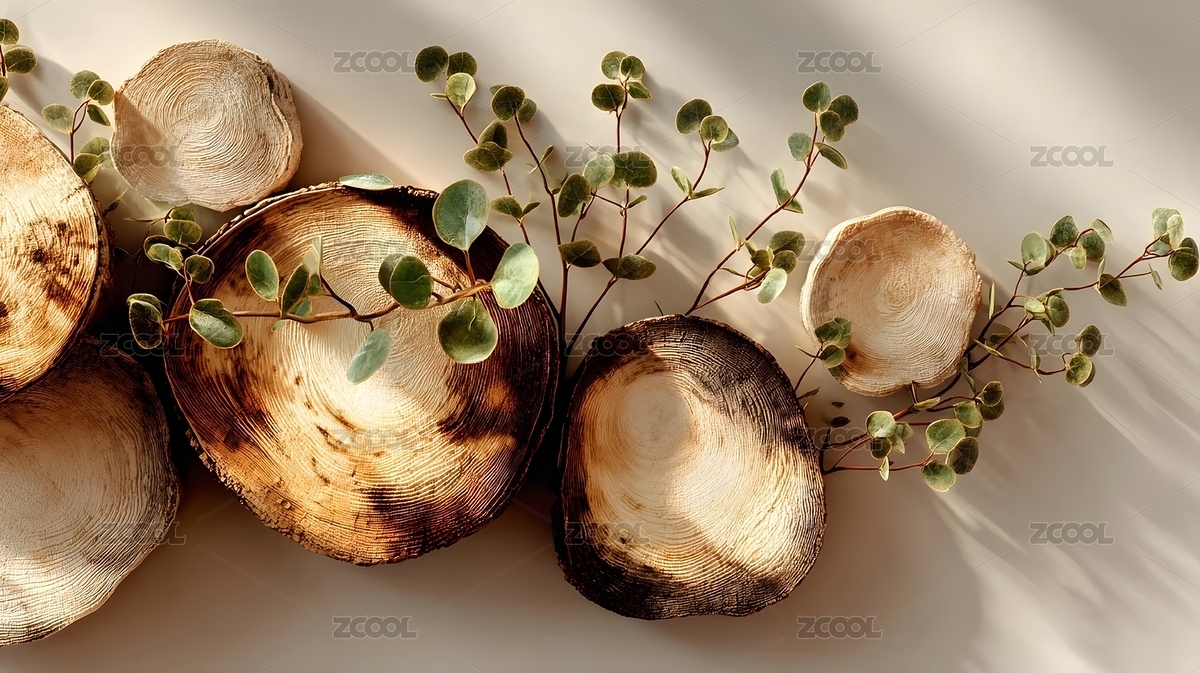 木纹年轮与绿叶装饰
