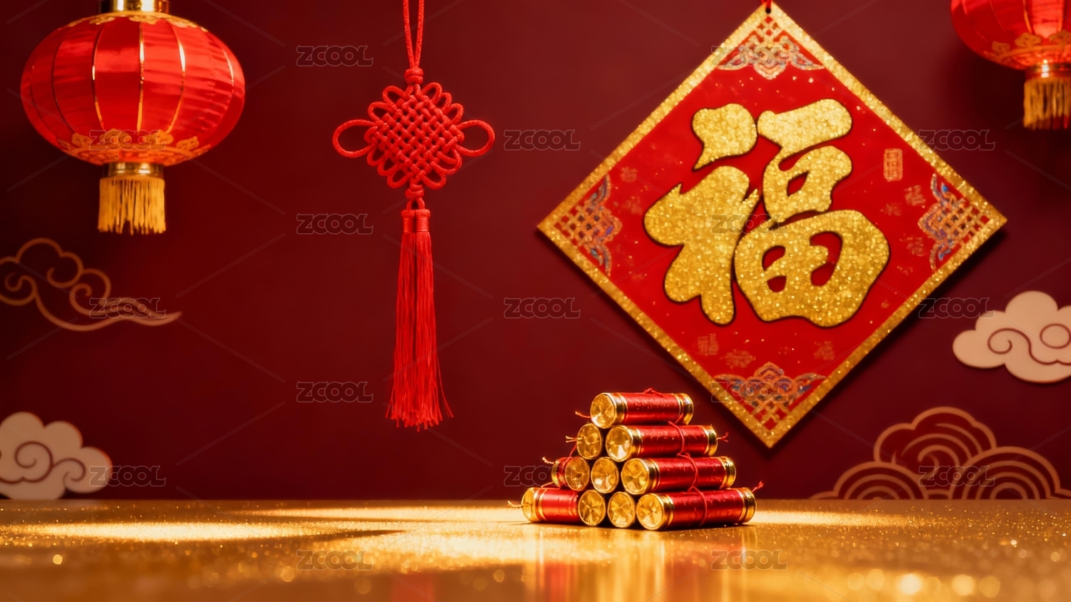 鞭炮,灯笼,中国结,春联,烟花,红色,传统文化,春节,装饰,插画