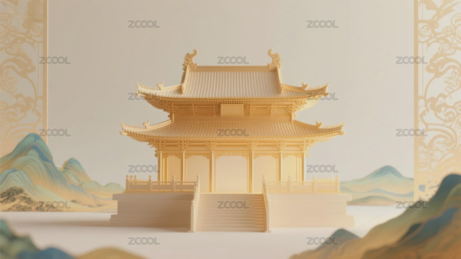 白色剪纸园林艺术建筑插画海报背景装饰画