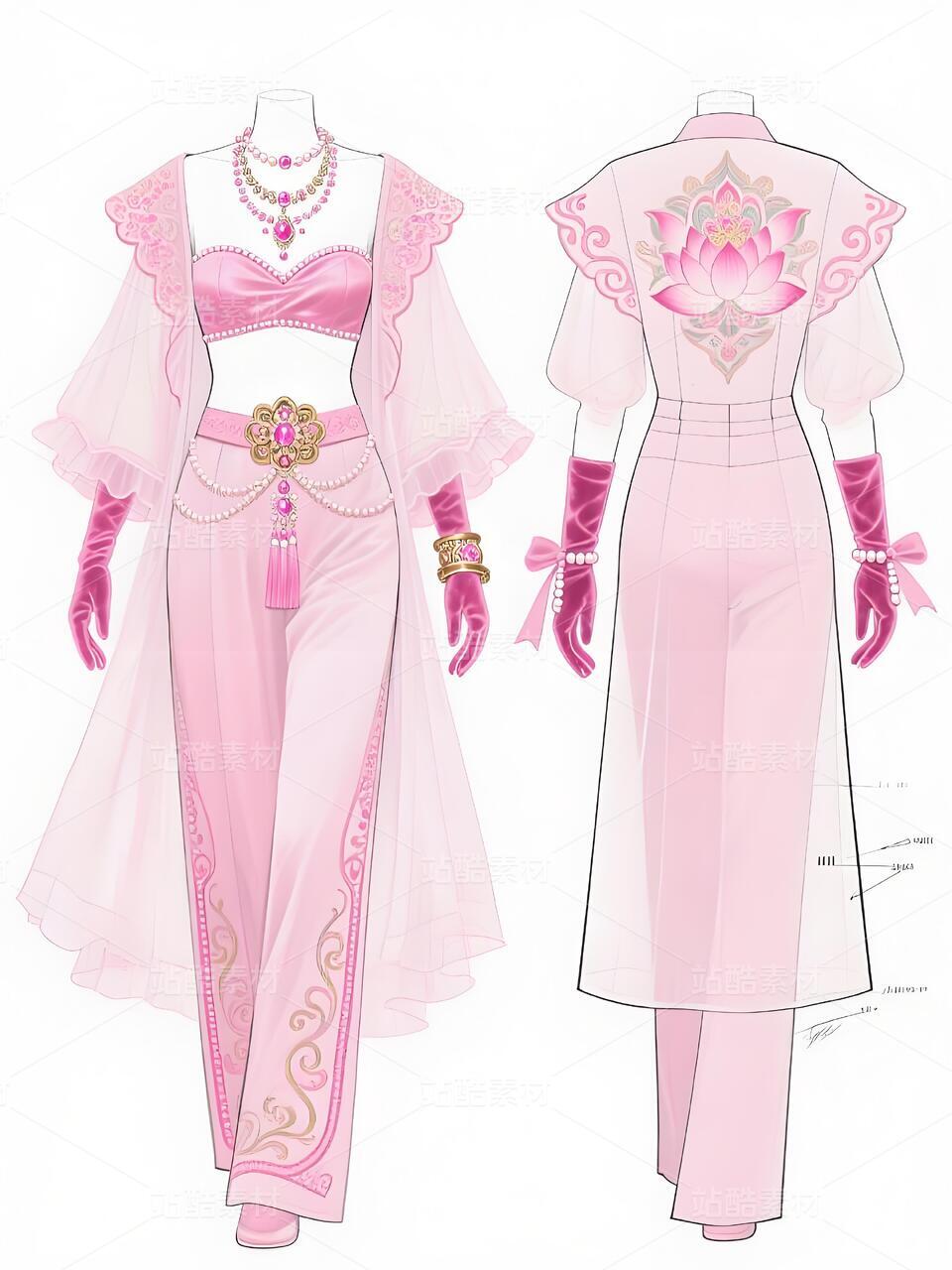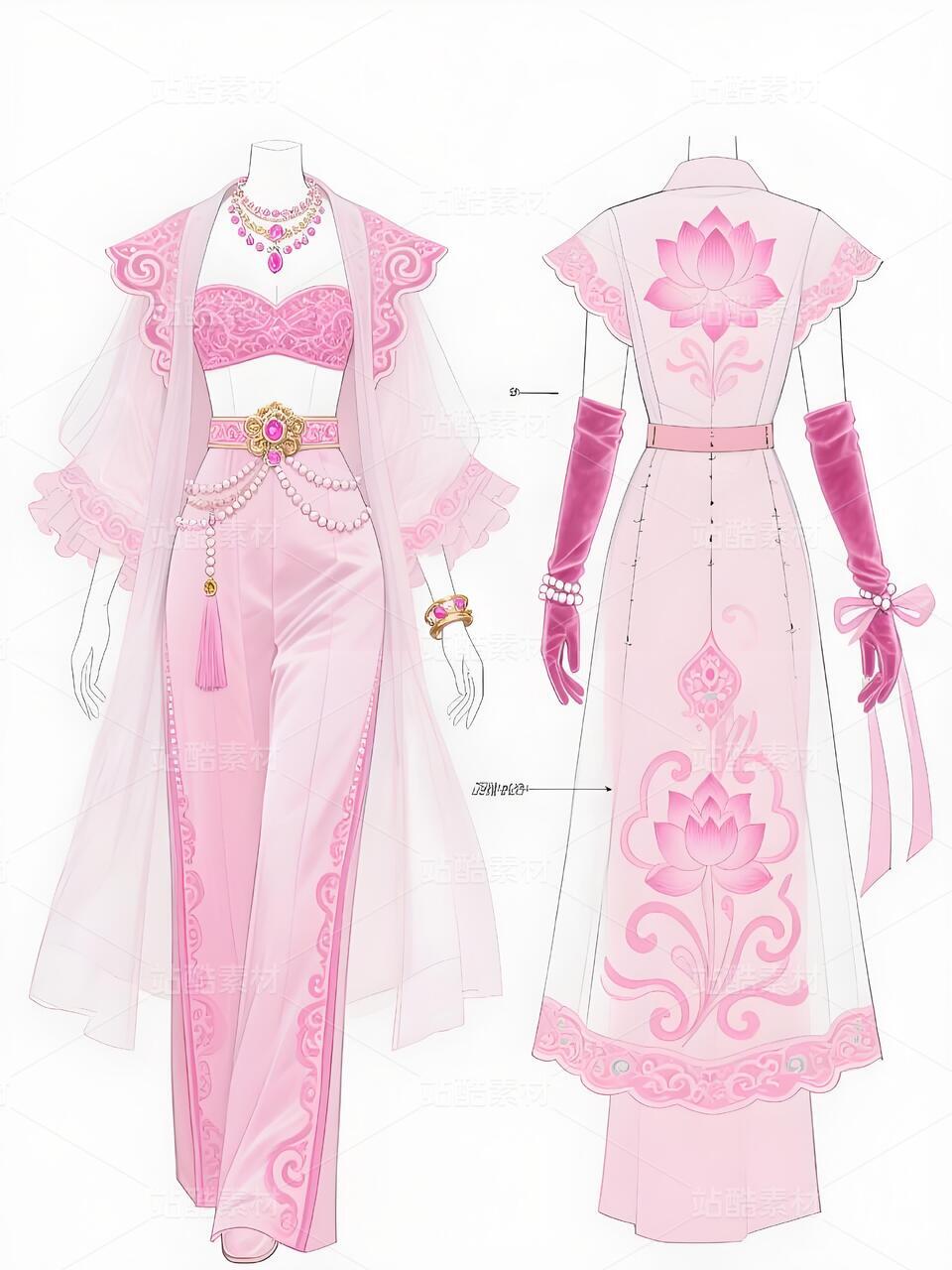 本系列将敦煌藻井璎珞纹样融入梦幻粉色调,打造柔美与恢弘并存的高定杰作。抹胸礼服以银粉渐变绸缎为底,上身密布珠片刺绣的璎珞纹样,裙摆展开藻井结构的层叠褶皱,浅粉薄纱上浮现金色脉络。外套采用不对称剪裁,右肩绽放立体莲花银饰,内衬暗藏反光粉黛云纹。阔腿裤侧缝垂落水晶璎珞流苏,与手套上的镂空纹样形成呼应。配饰将飞天飘带转化为粉晶珠链,在白色背景下演绎敦煌壁画中的浪漫仙境。