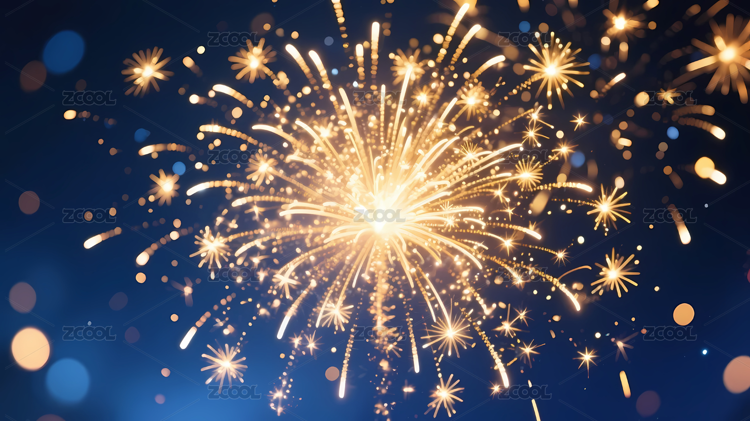 蓝色,主体,黄色,深蓝,烟花,绽放,三朵,节日,光点