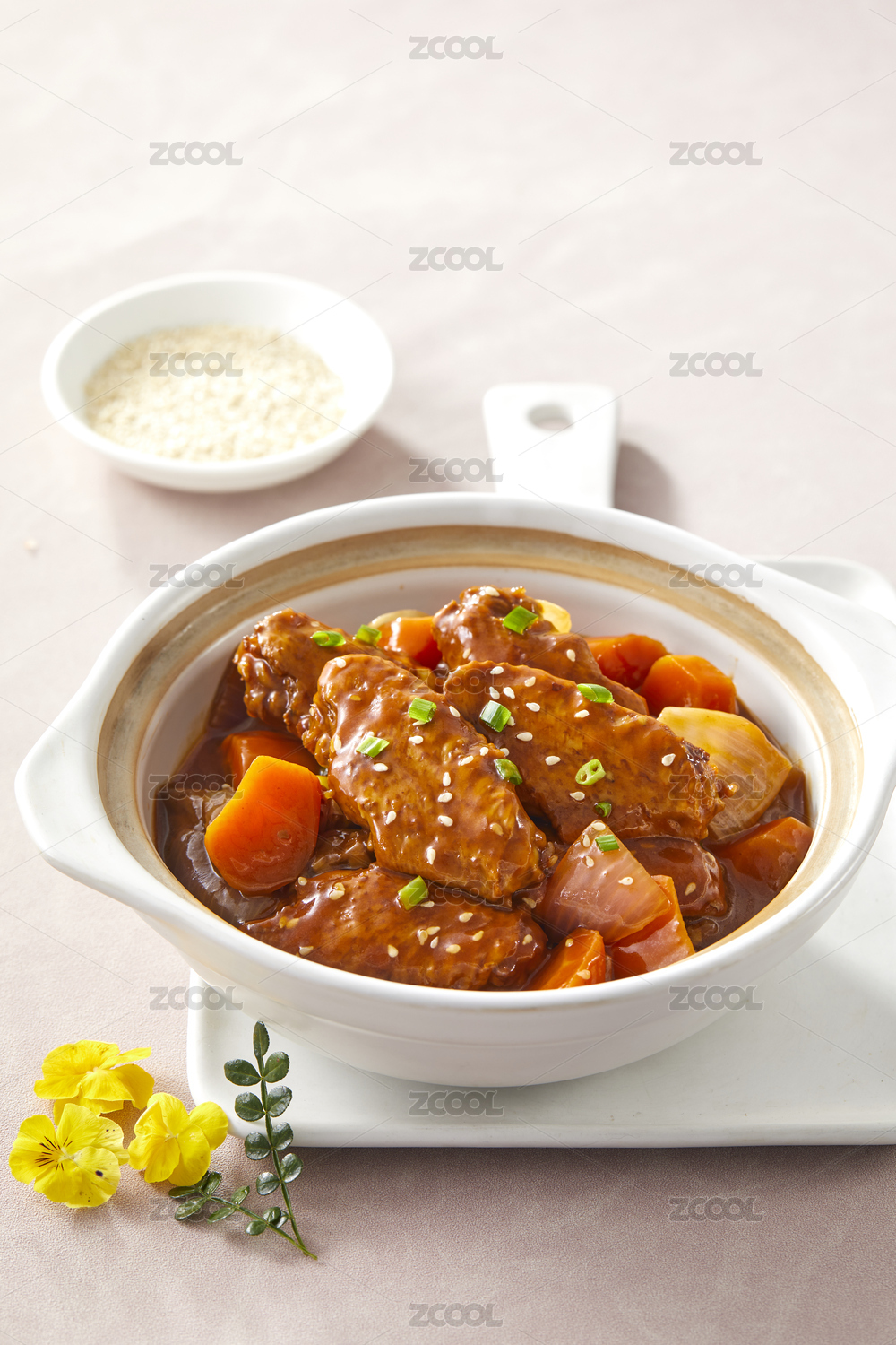 用筷子从砂锅中夹起红烧牛窝骨特写深色调