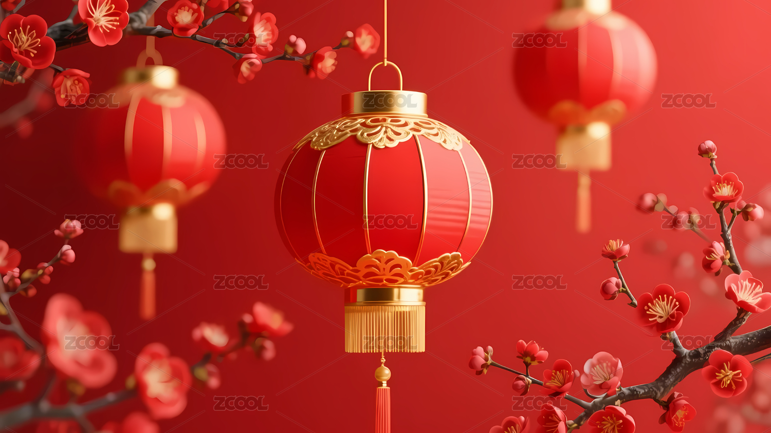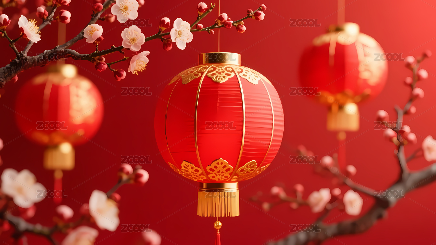 红色,黄色,节日,喜庆,灯笼,树枝,花朵,浓厚