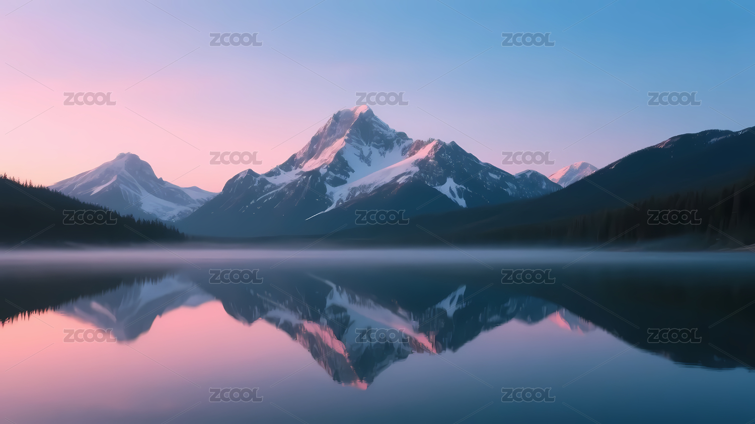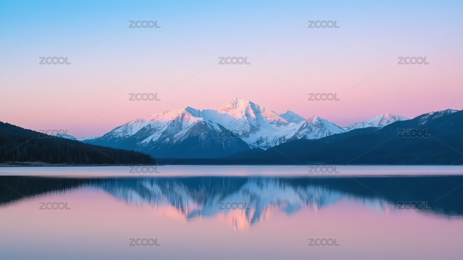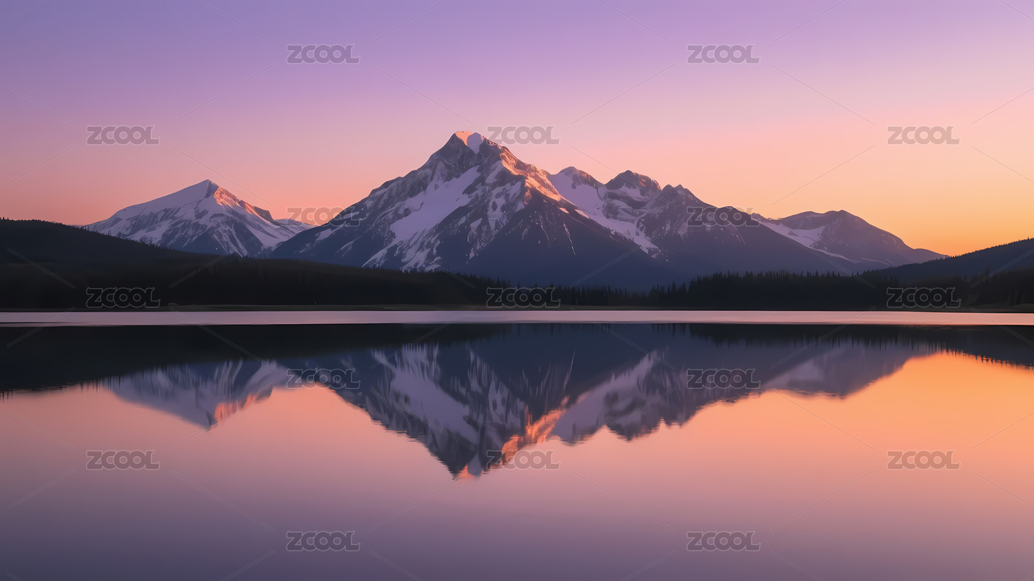 宁静,深蓝色,树木,山峰,雪,倒影,湖泊,粉紫色,晚霞,夜幕