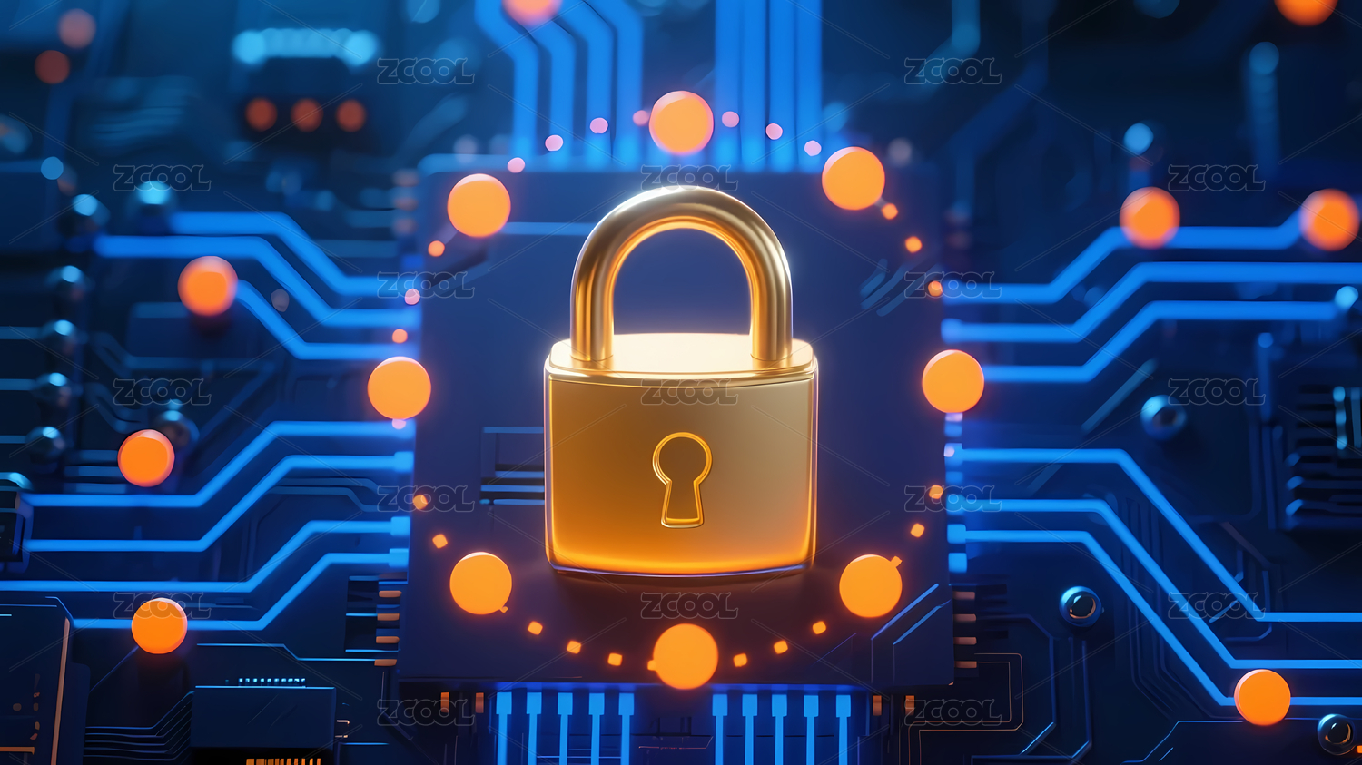 金色锁映衬蓝橙电路板背景