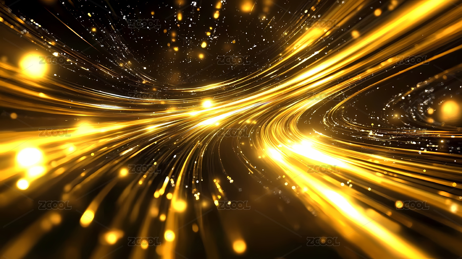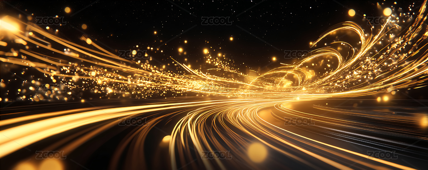 黑色背景上的金色光轨线条耀斑颗粒粒子壁纸