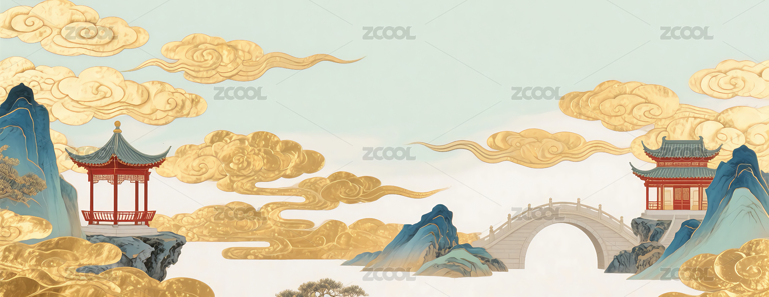 国潮,天空,祥云,红色,建筑,背景,插画,小桥,渐变,高山