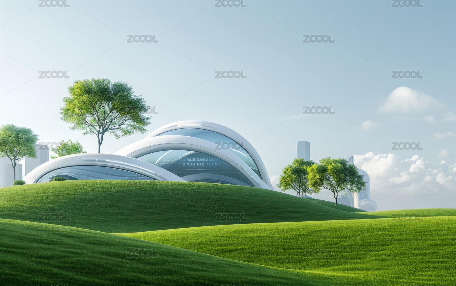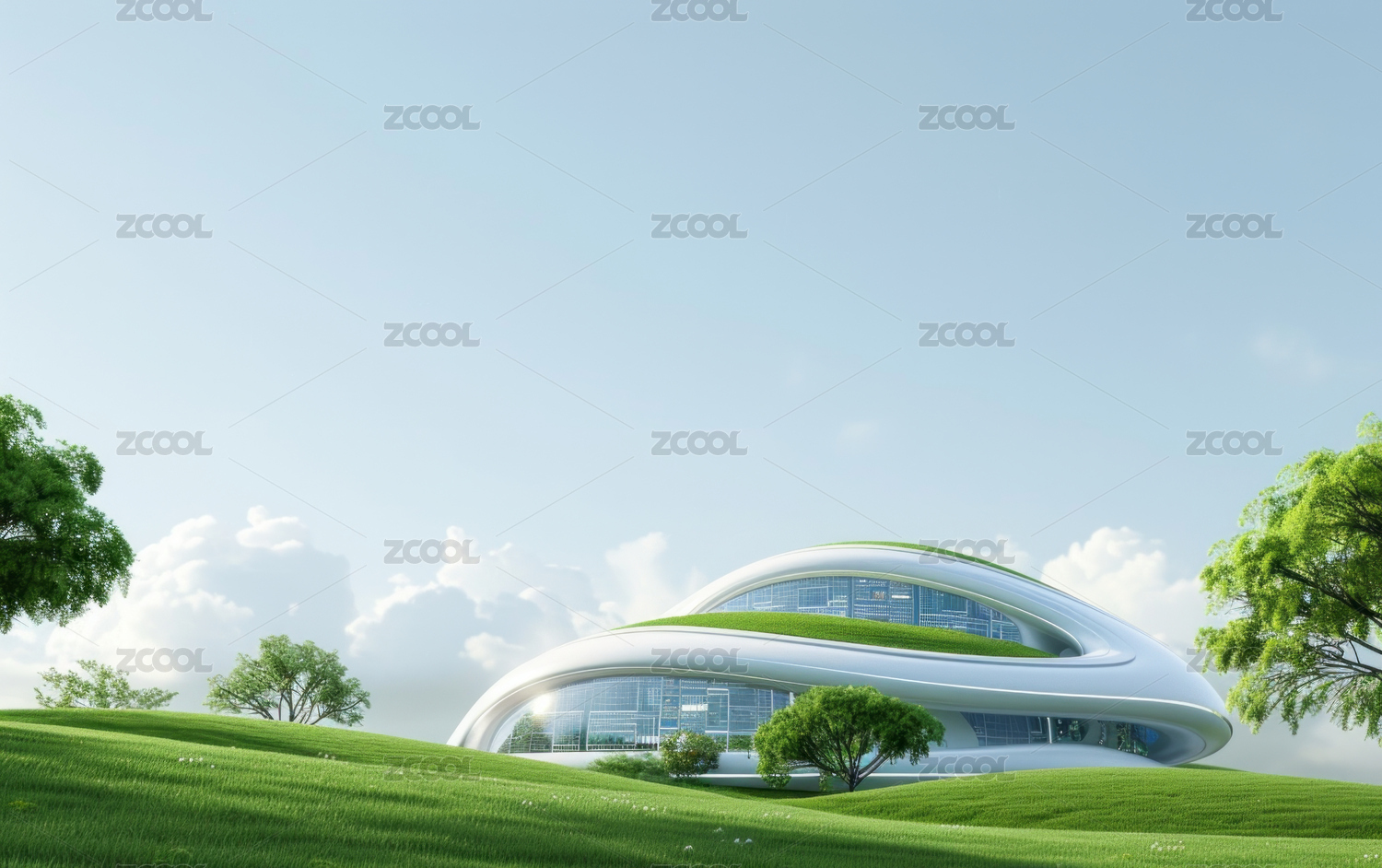 园林里巨大落地窗弯曲造型现代建筑外部空间