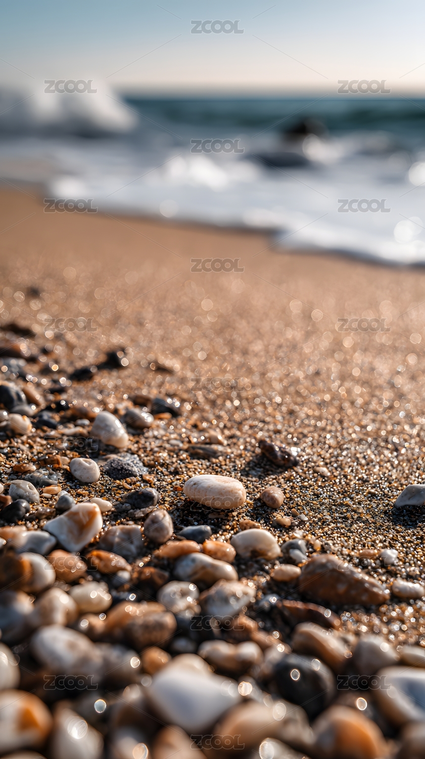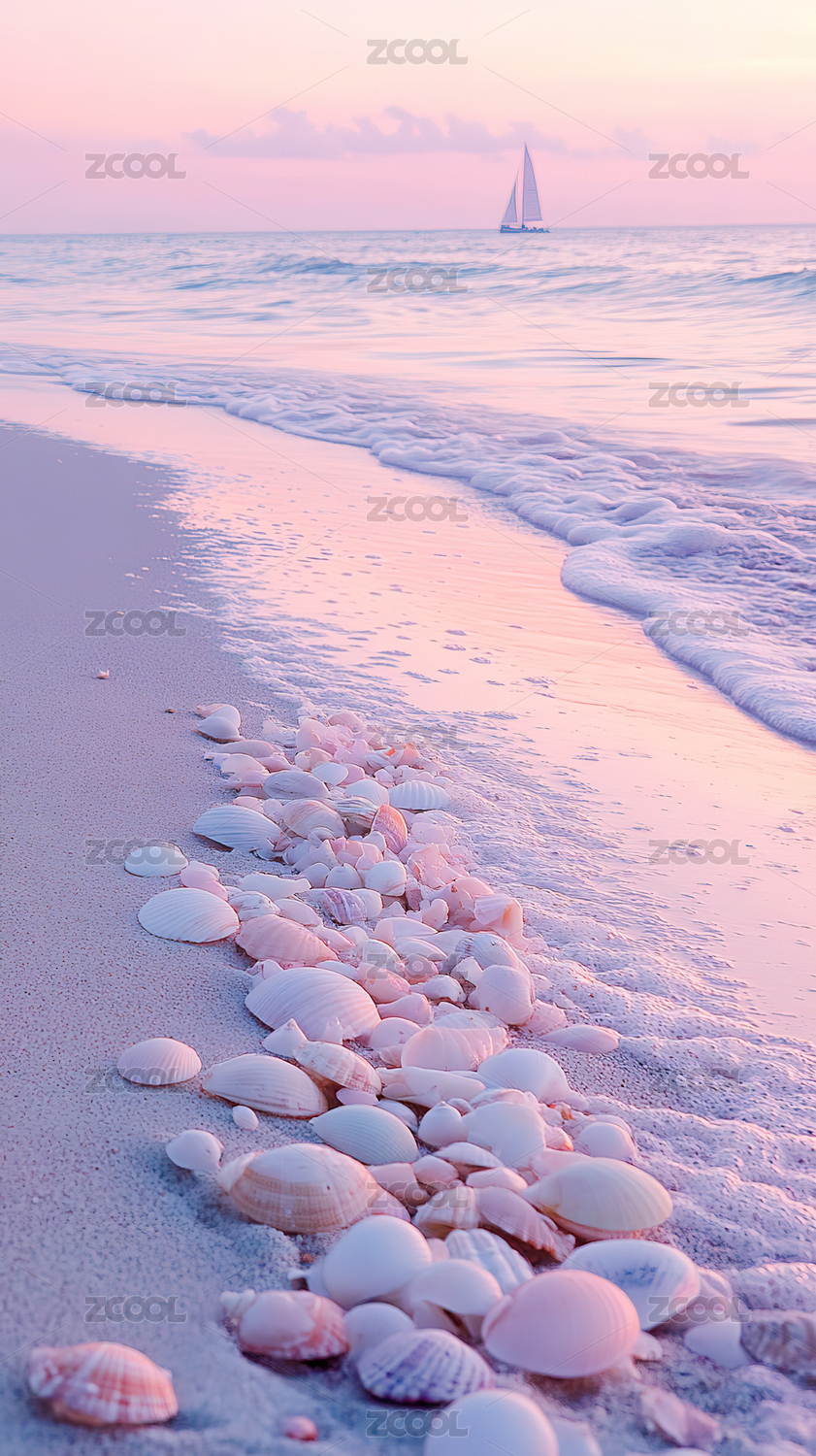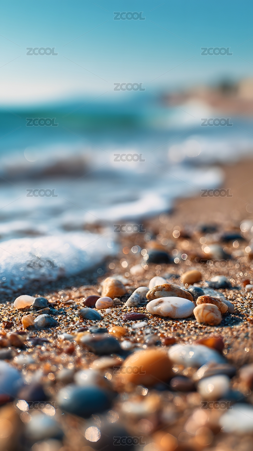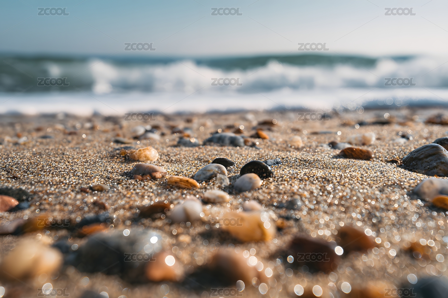 日落时分的宁静海滩海浪轻拍沙滩天空被染成橙红色沙滩上散落着贝壳和石头