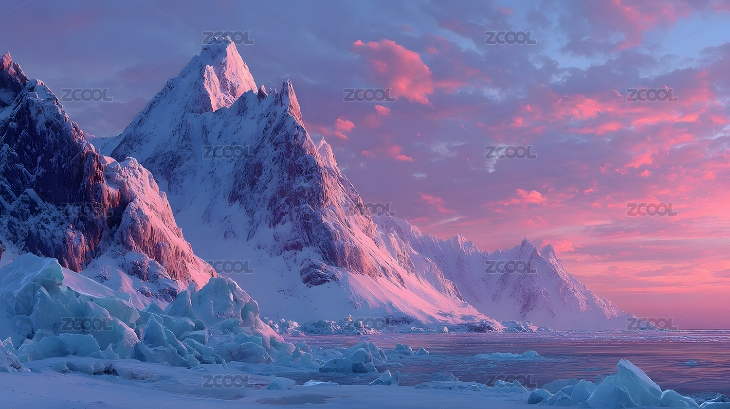 雪山峰峦与粉紫色晚霞壮丽景观图