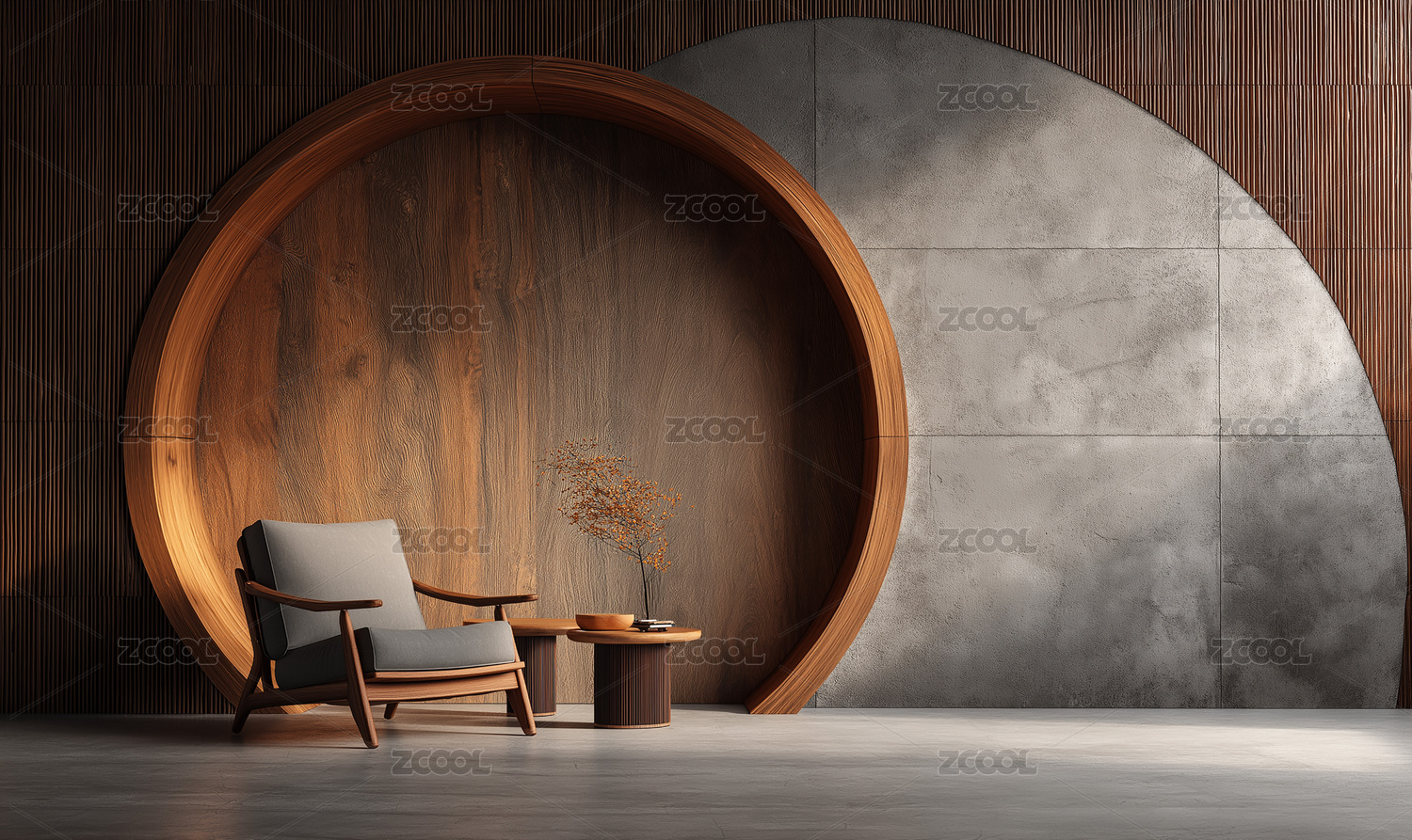 灰墙前圆形木饰旁休闲椅与枯树场景