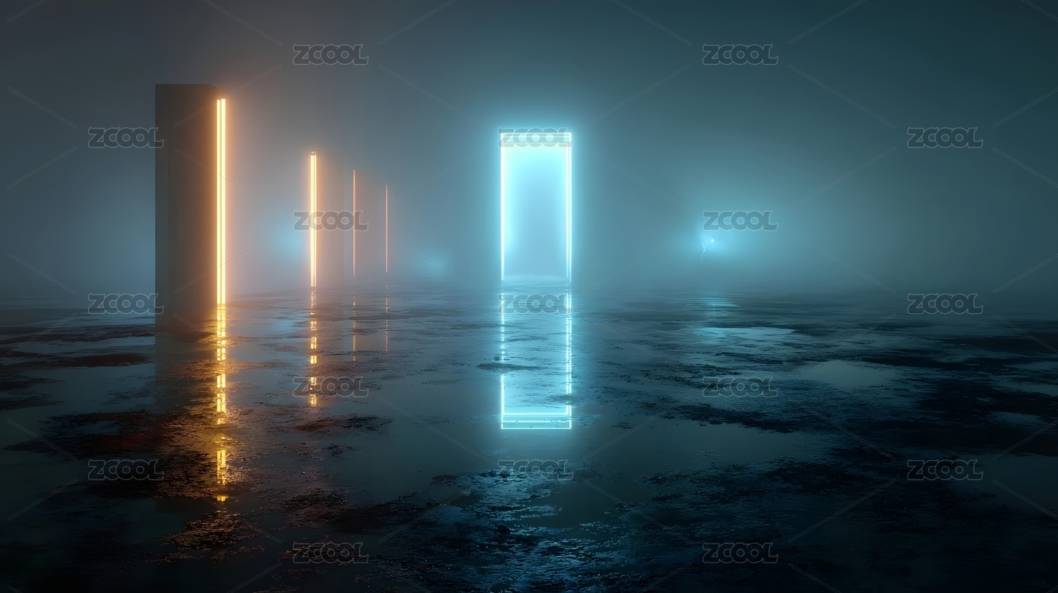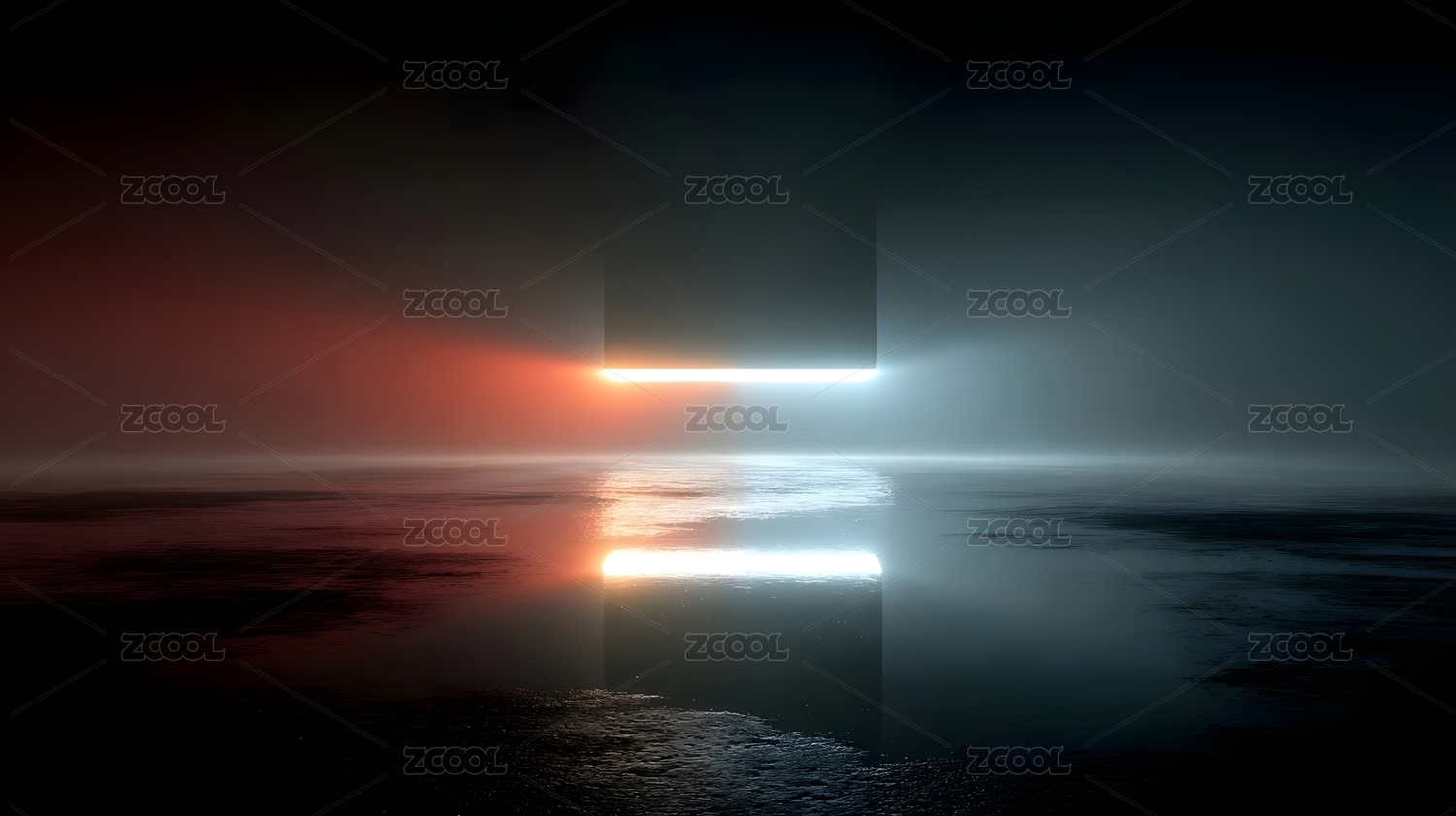 灯光,反射,雾气,空间,地面,光影,色彩,极简,氛围,科技感