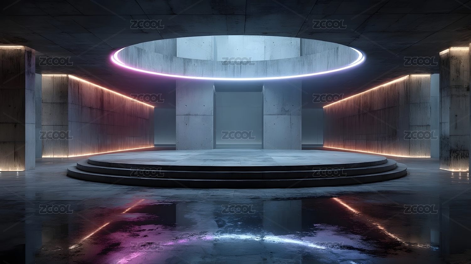 蓝色霓虹灯环绕的圆形展台,置于黑暗空间中