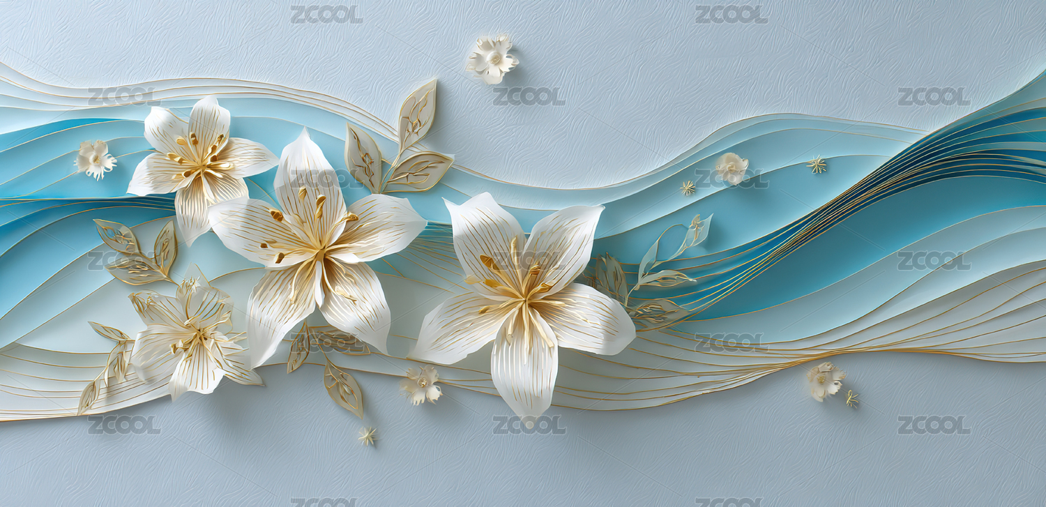 清新淡雅蓝色水面漂浮的花朵3D立体插画