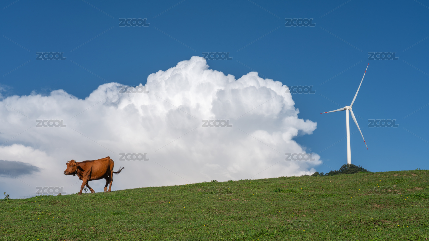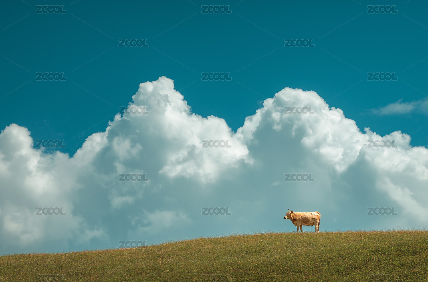 黄牛,草坡,蓝天,白云,绿色,自然,风景,户外,田园,宁静