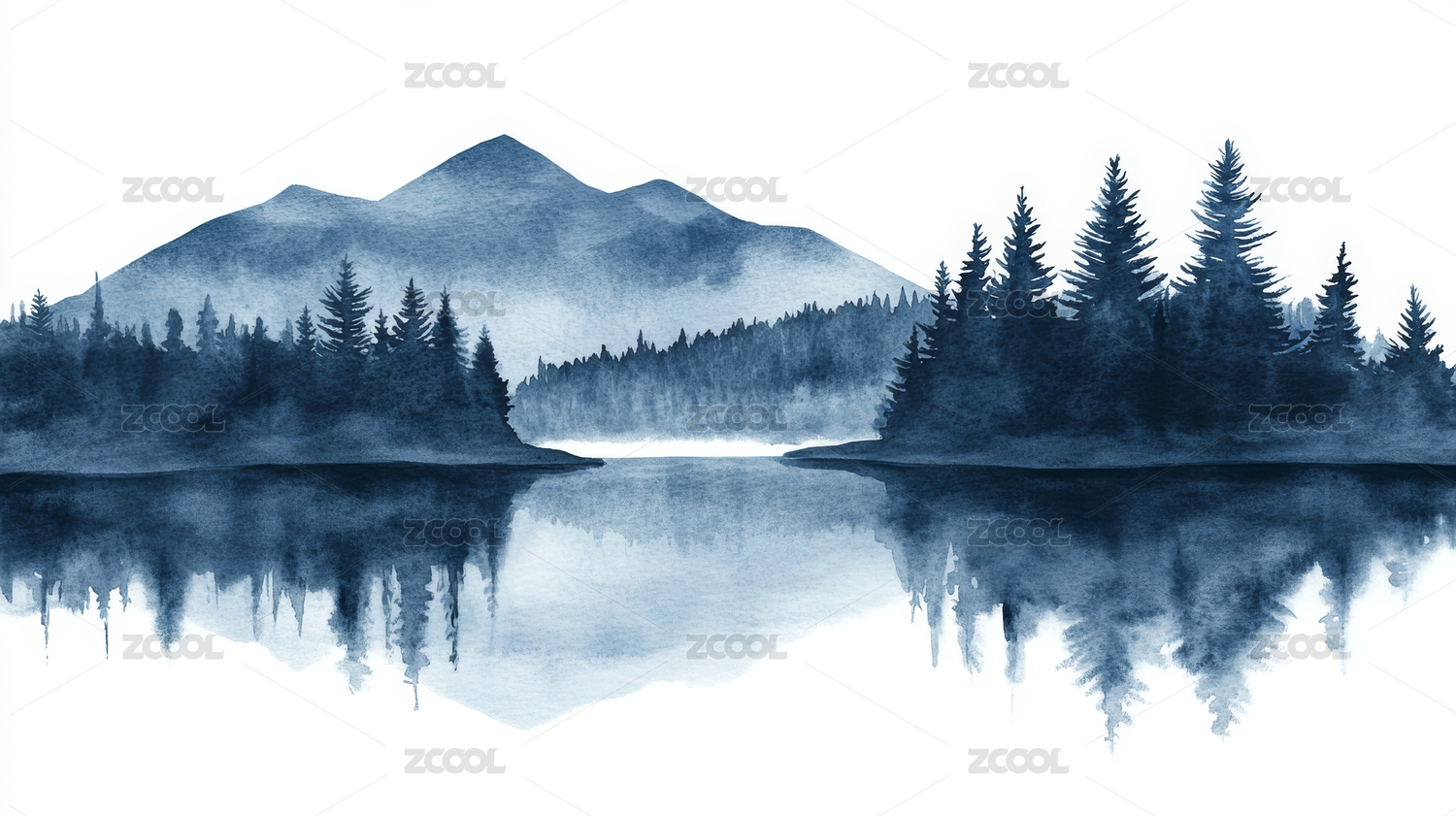 水彩画,岛屿,松树,湖水,日落,倒影,岩石,自然,风光,高树