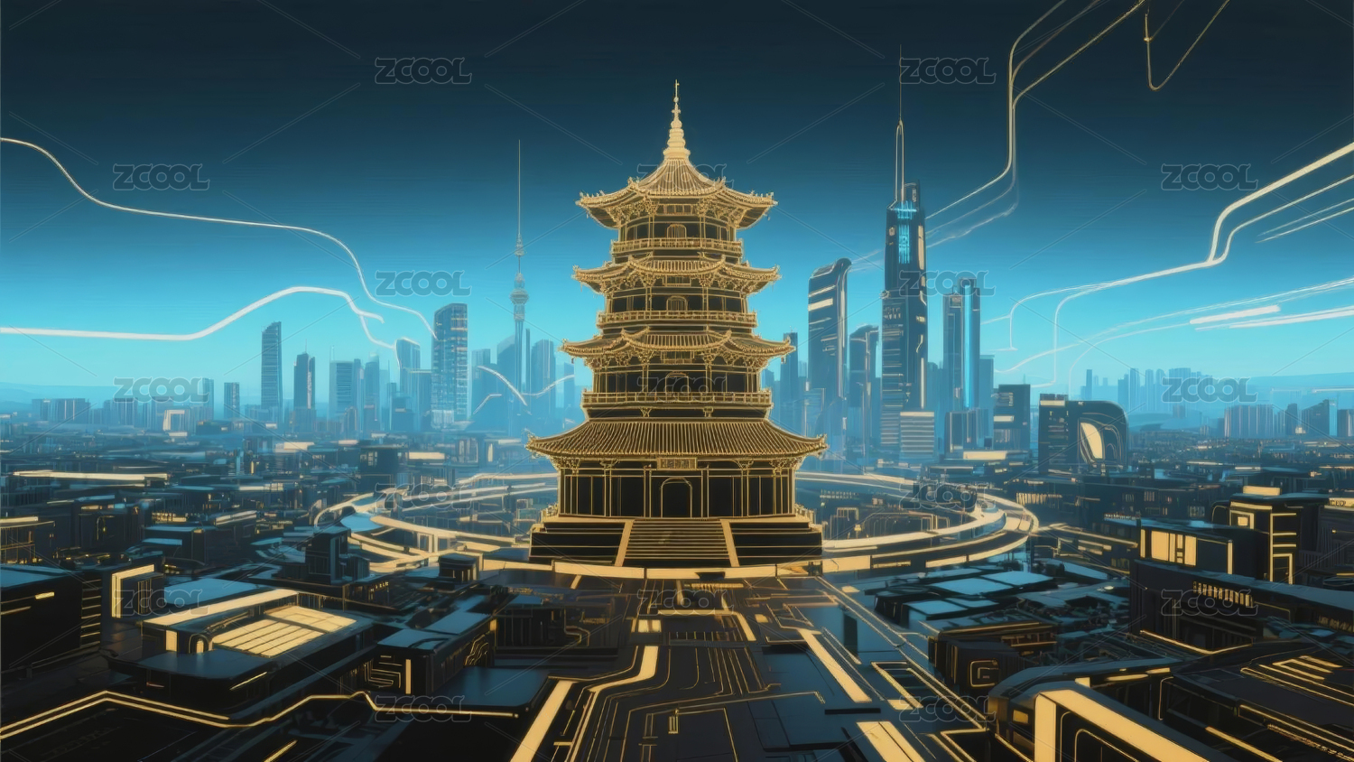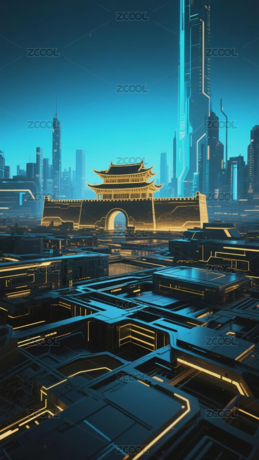 赛博朋克风传统建筑背景
