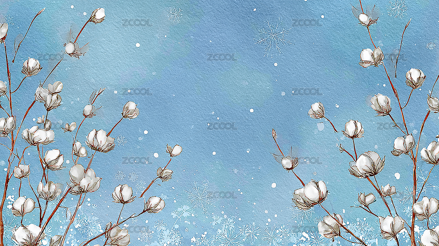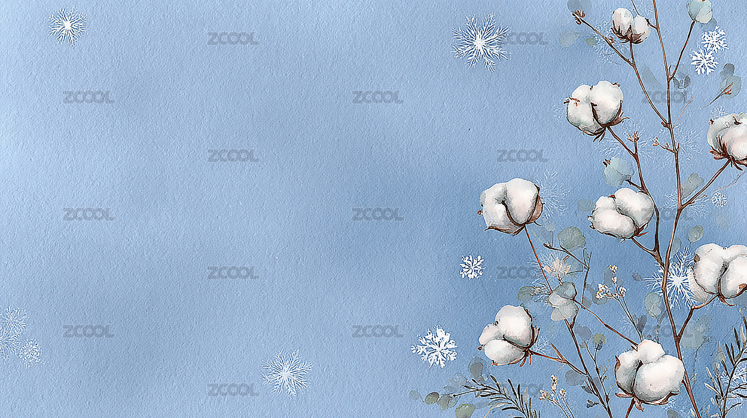 棉花,雪景,棉枝,雪花,蓝色,白色,花朵,花枝,水彩,风格