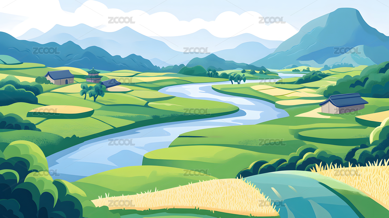 山水田园风光河流房屋景象