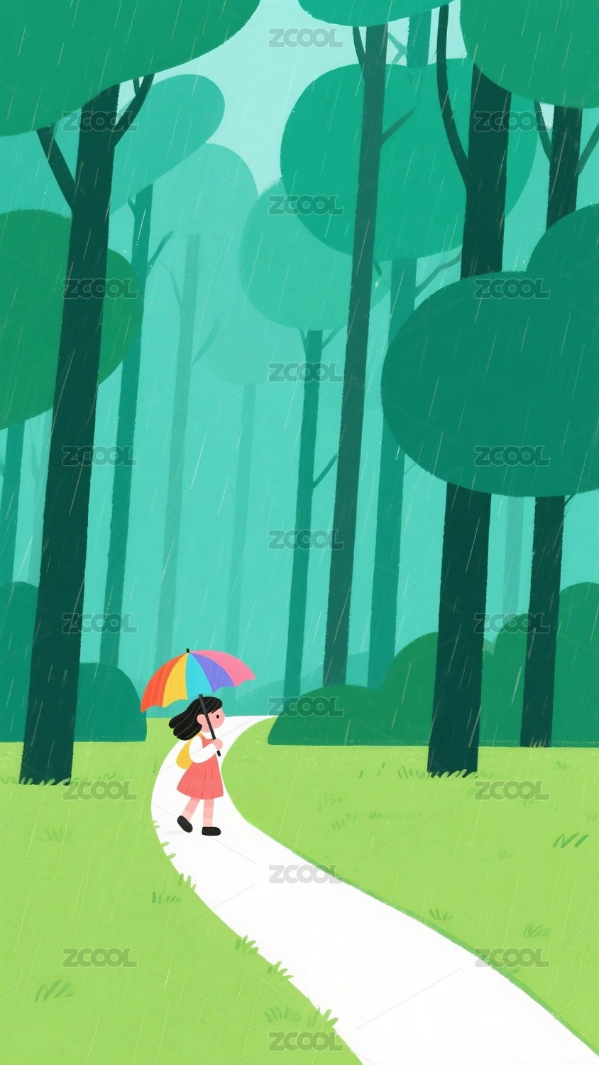 下雨天女孩打伞在树林走