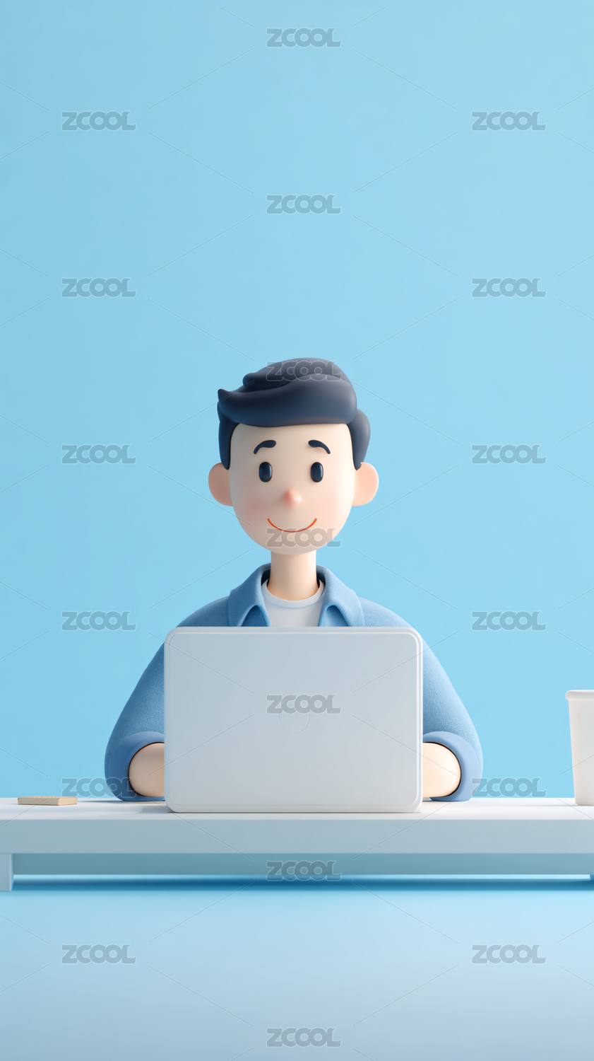 3D职场男士坐在椅子上使用笔记本电脑工作