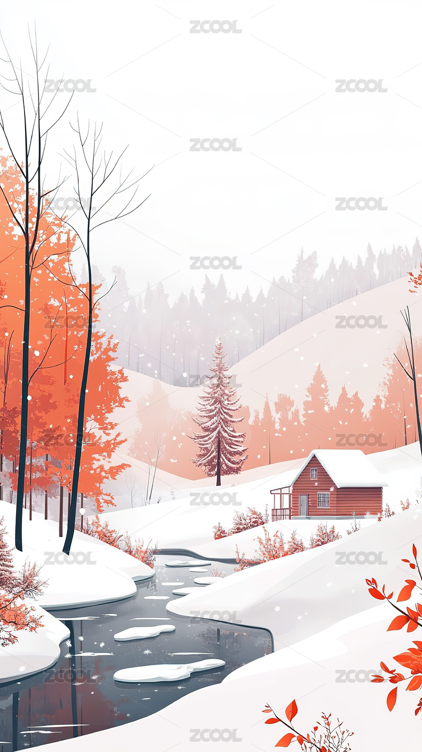 冬日雪景小屋插画