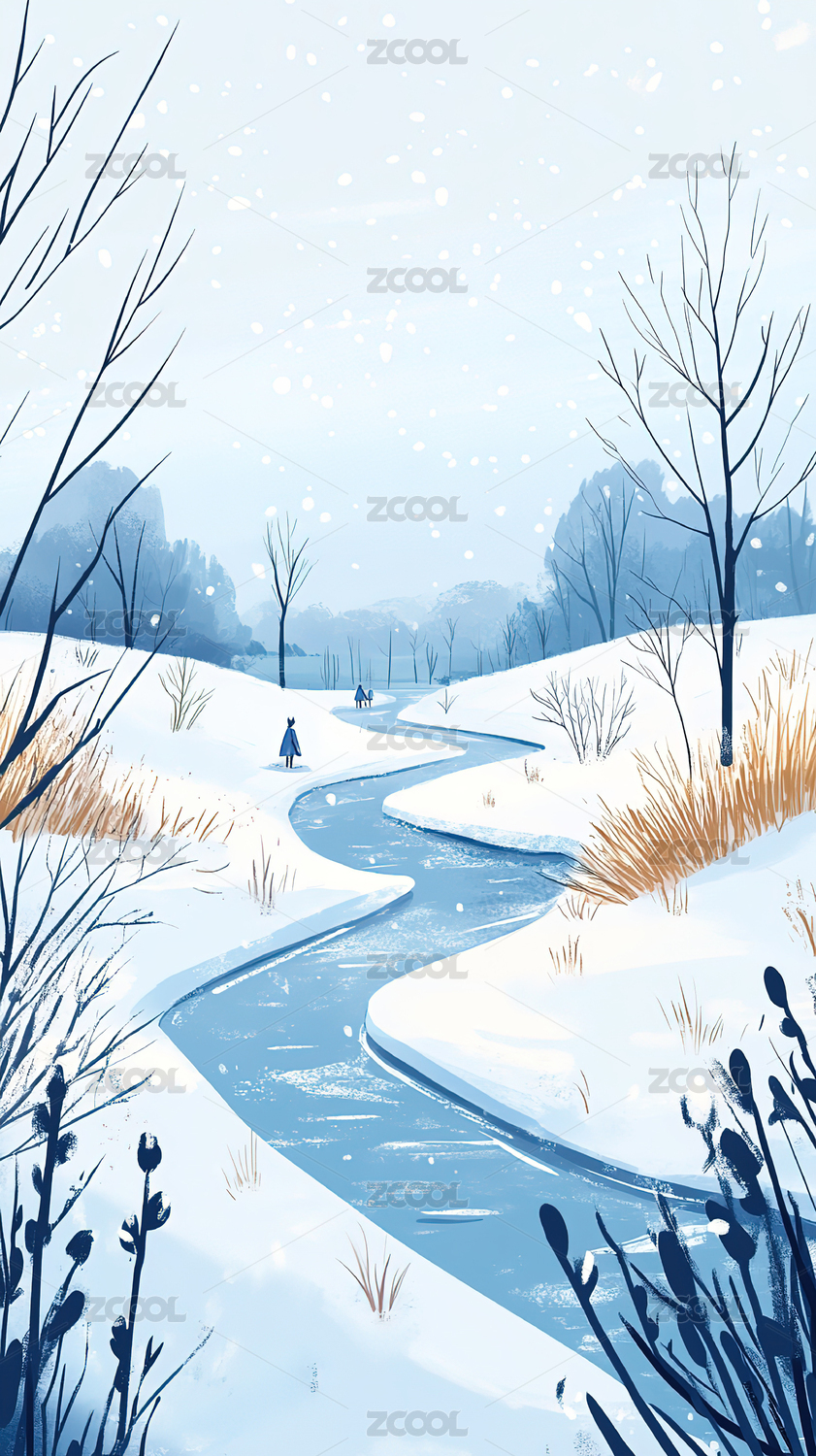 冬天雪地上的情侣节气插画大雪竖版