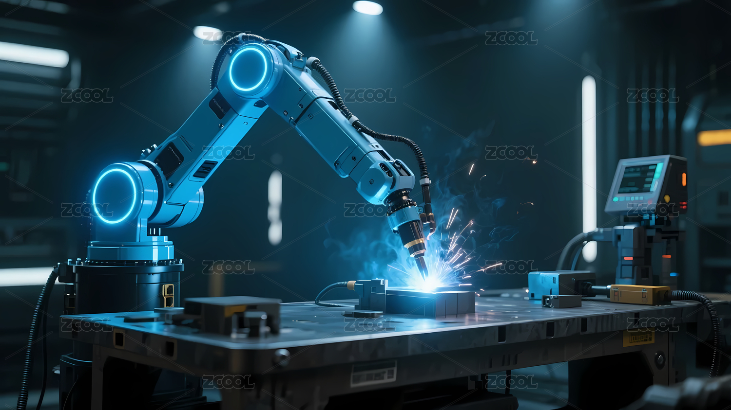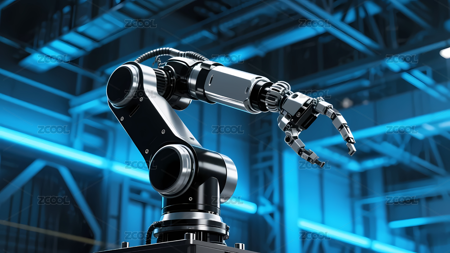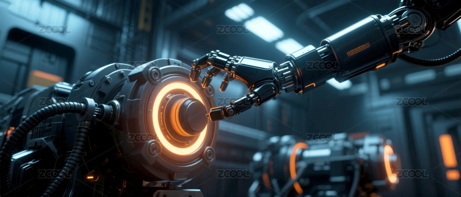 金属,银色,反光,机械臂,激光束,黑色,黄色,抓手,轴承,管线