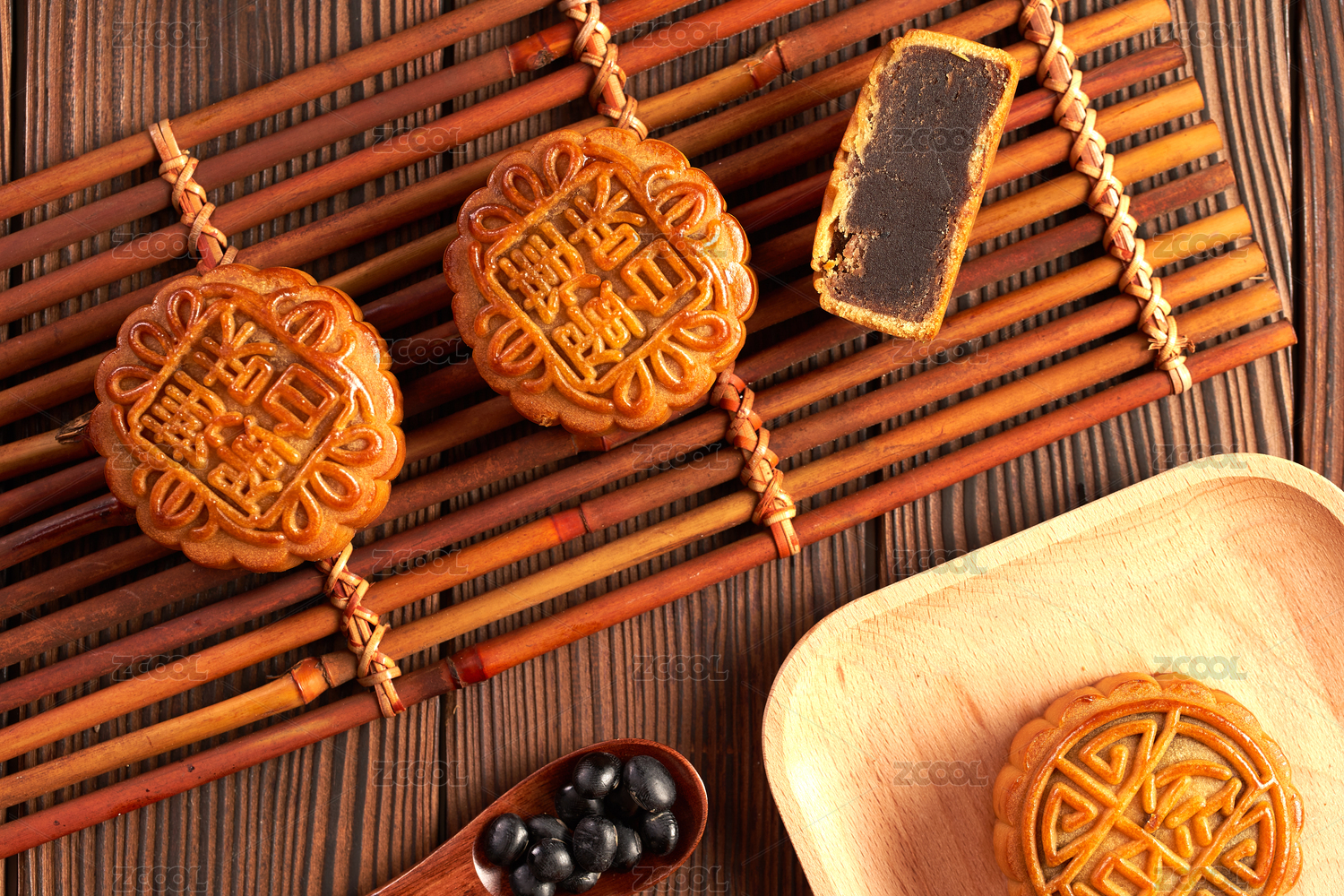 中秋节传统美食月饼与茶水特写古窗棂木桌面