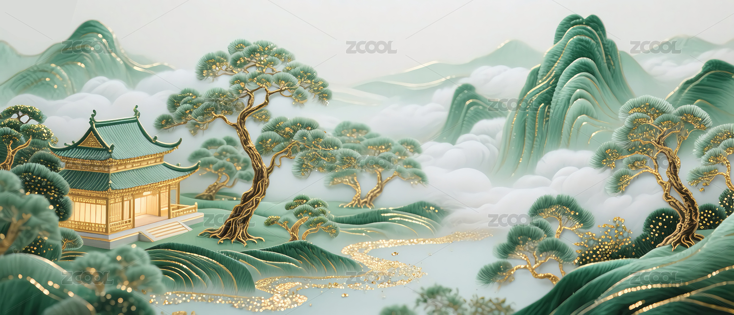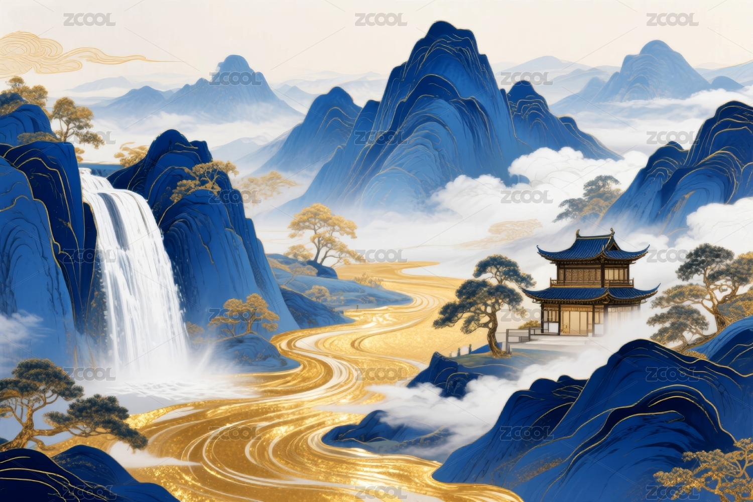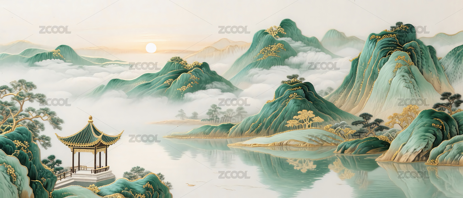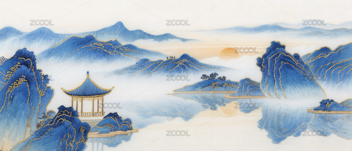 古建筑,山水,风景,插画,背景,天空,云雾,写意,国画,画卷