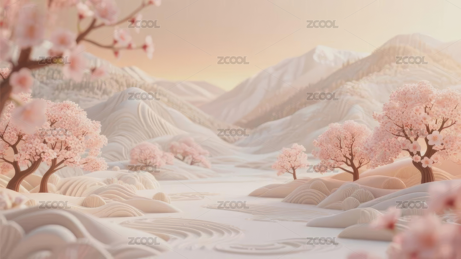 春天粉色樱花流水唯美自然风光清新卡通插画