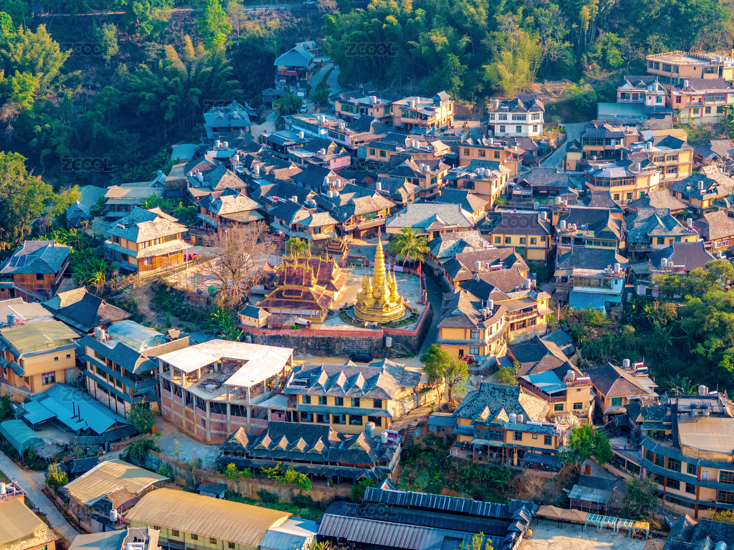 中国云南普洱澜沧县景迈山金塔佛寺航拍风光