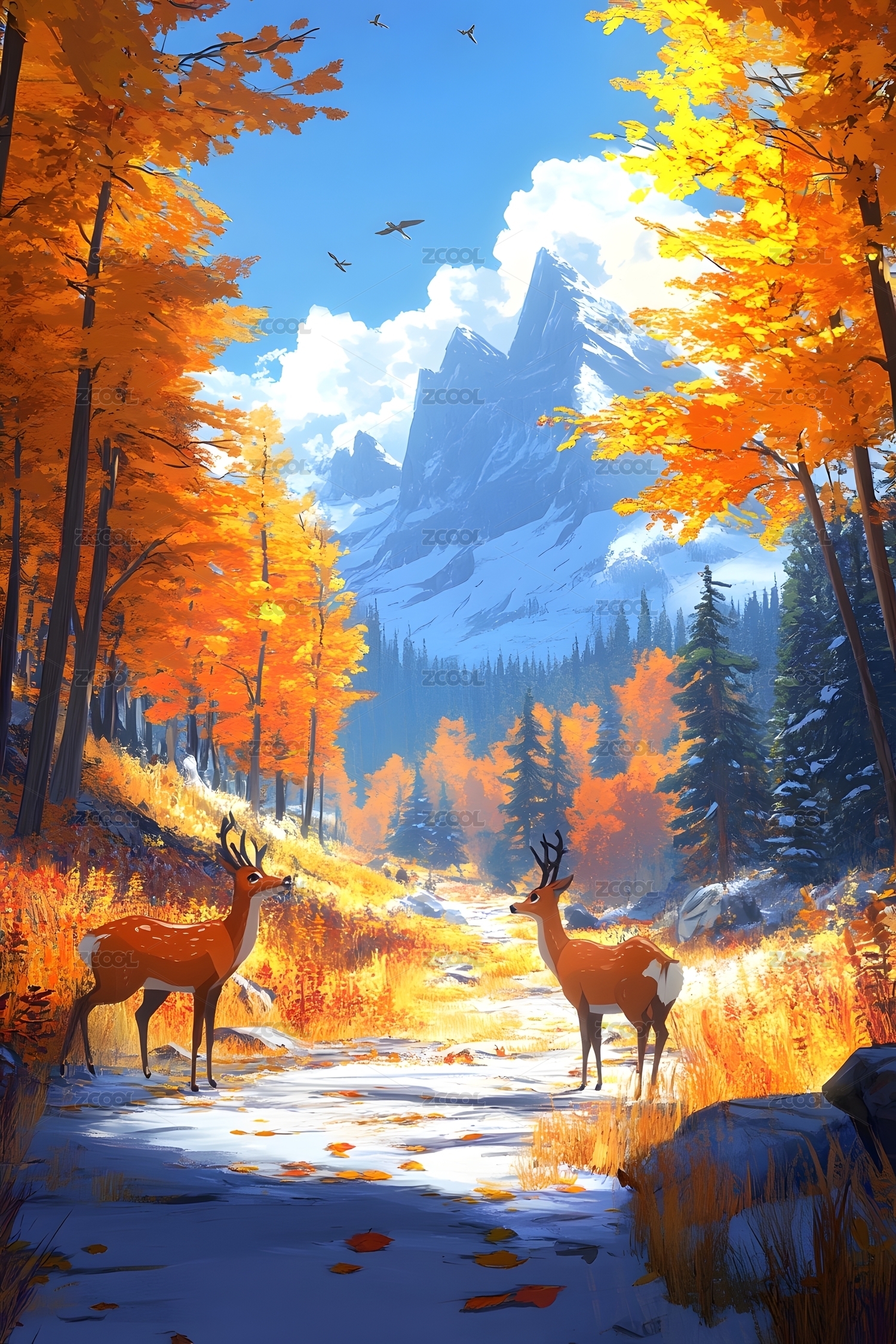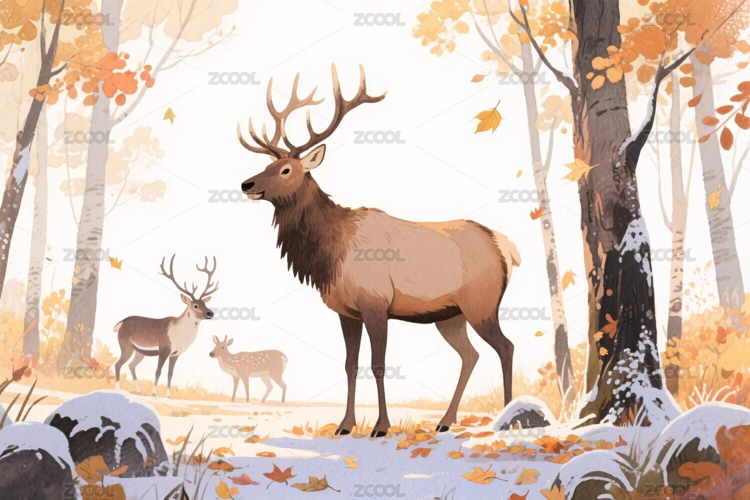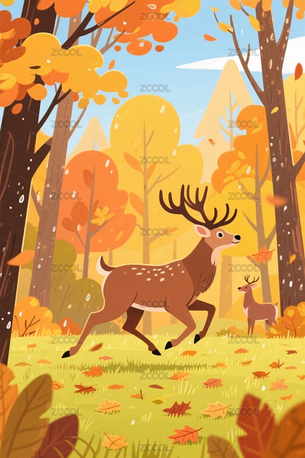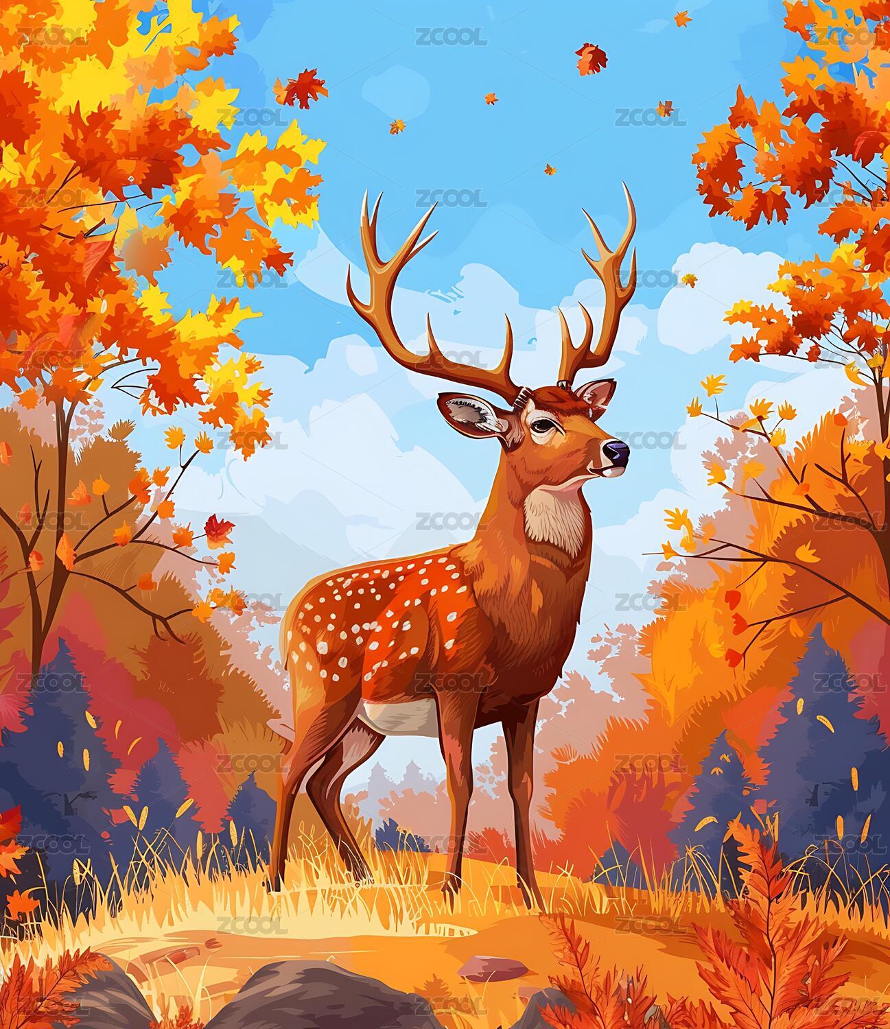 森林,麋鹿,秋叶,秋色,森林插画,插画,自然,动物,秋季,野生动植物