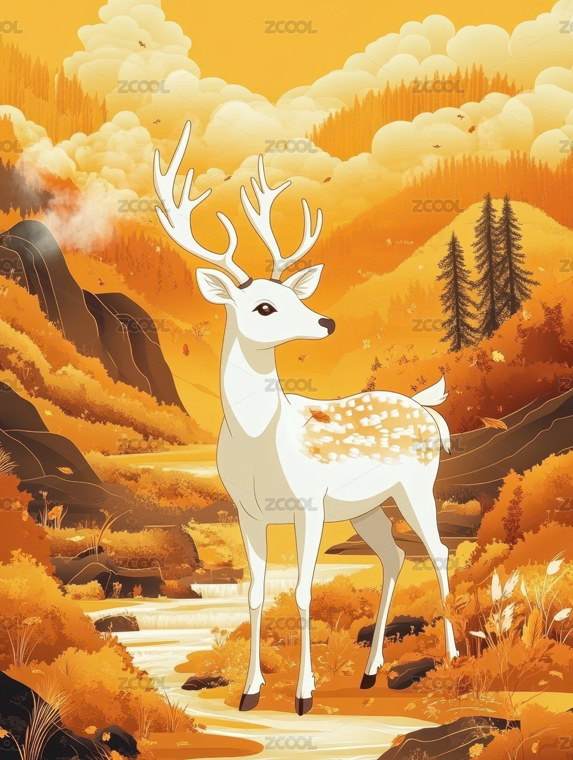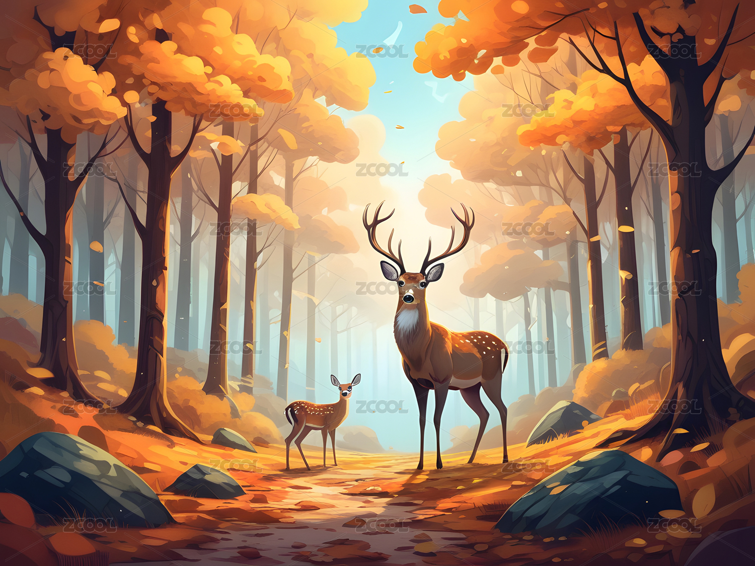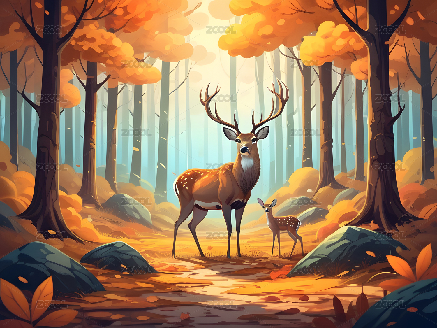 森林,树木,秋季,自然,插画,草地,落叶,小鹿,秋景,卡通