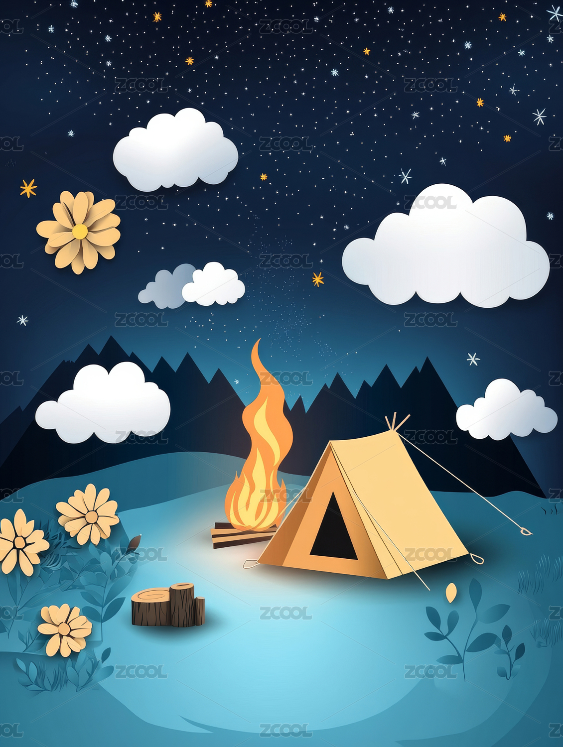 夜晚户外露营剪纸插画