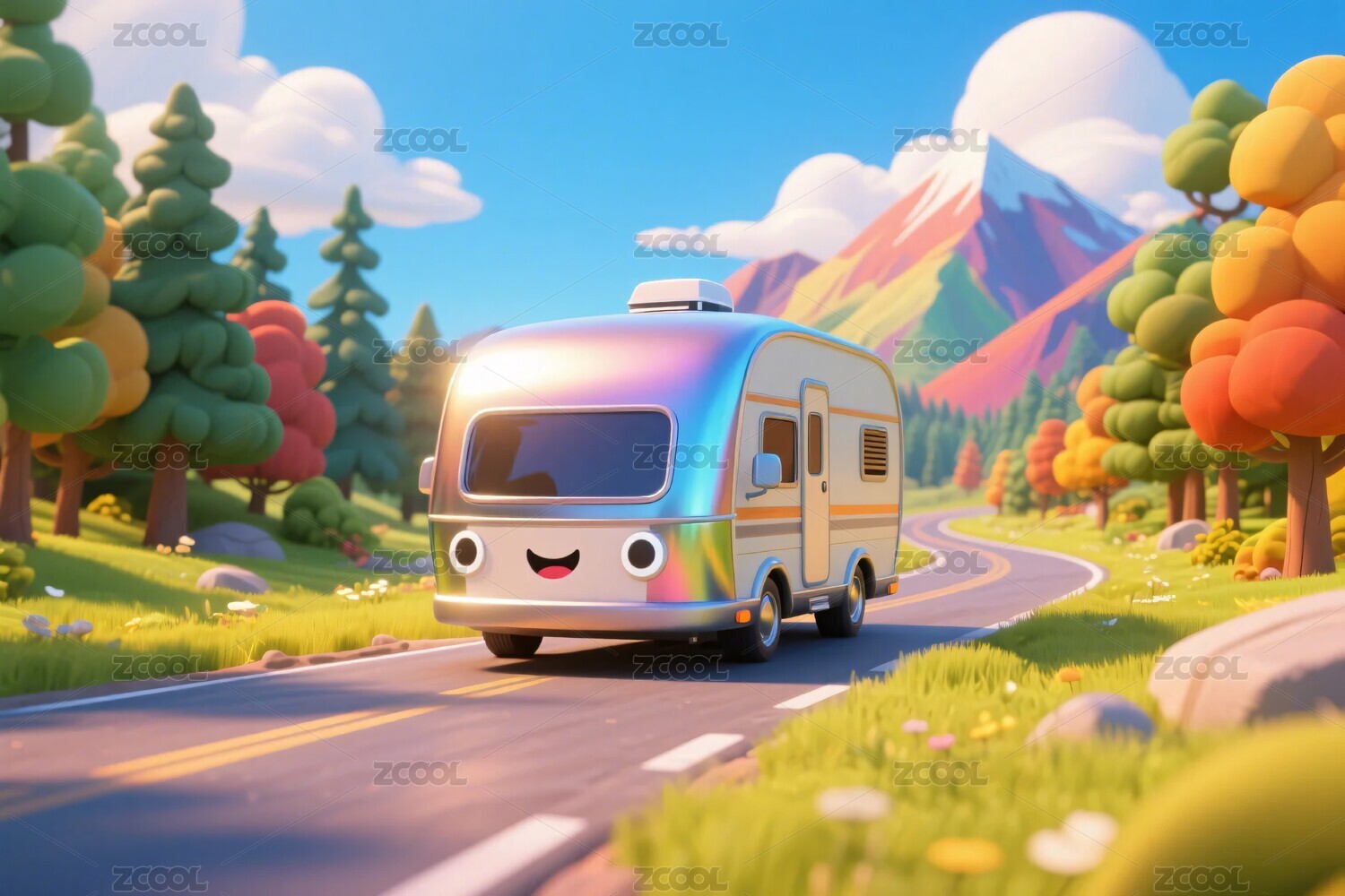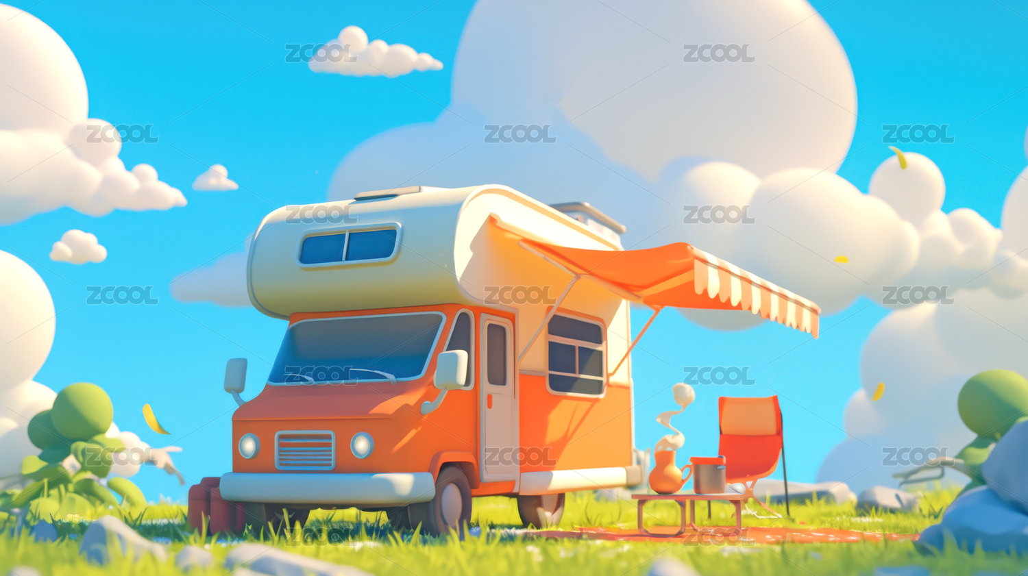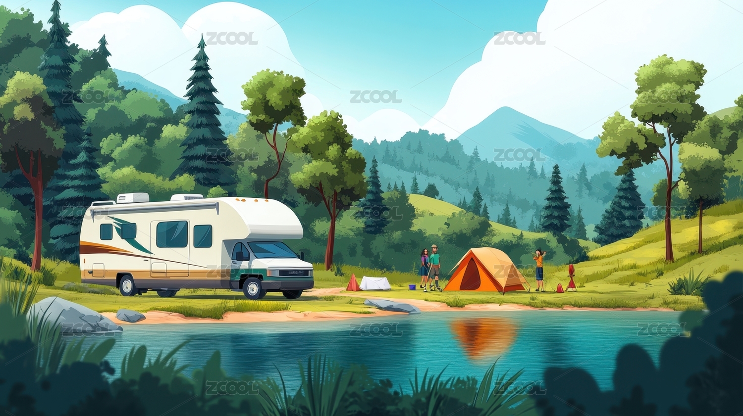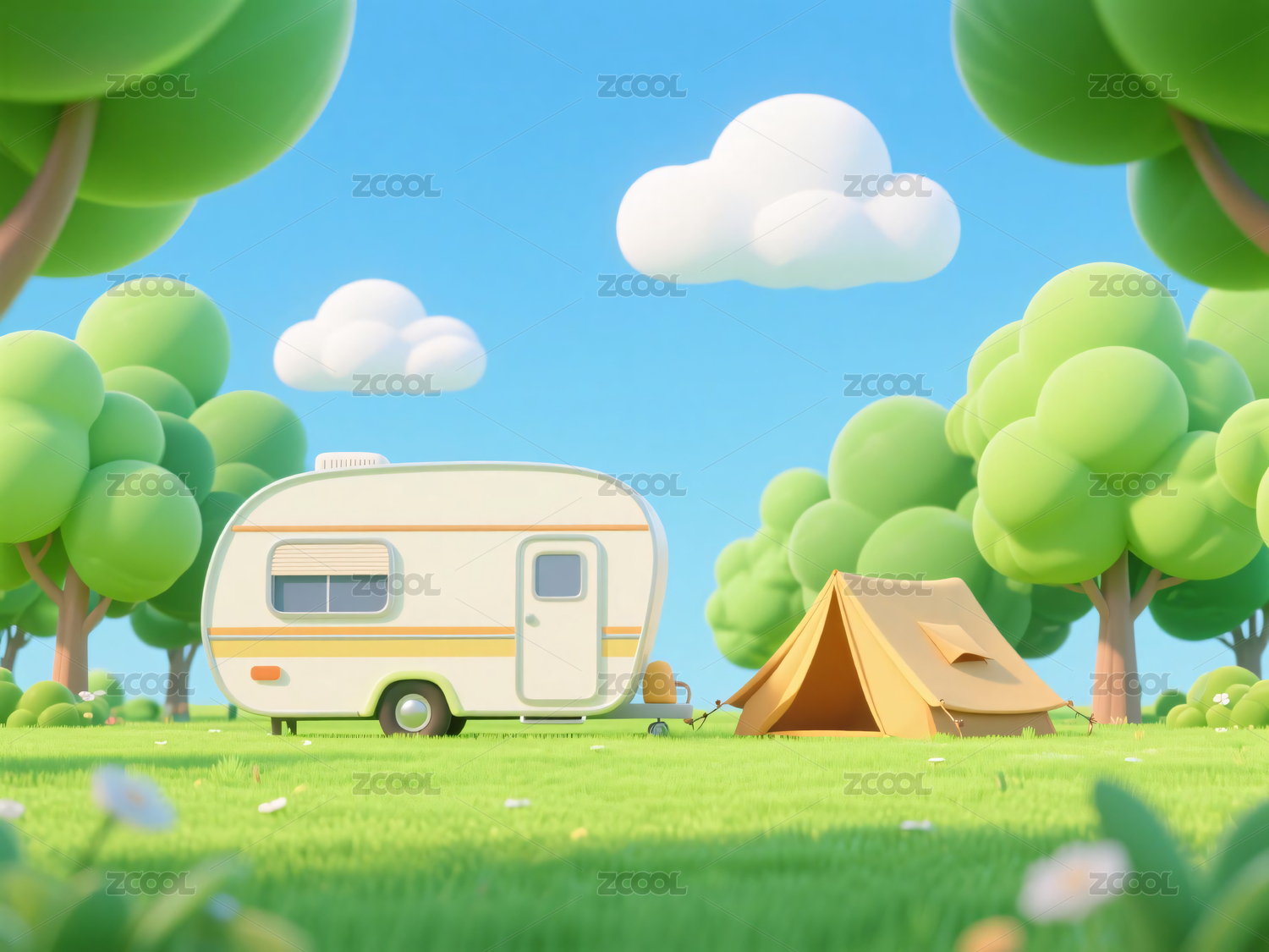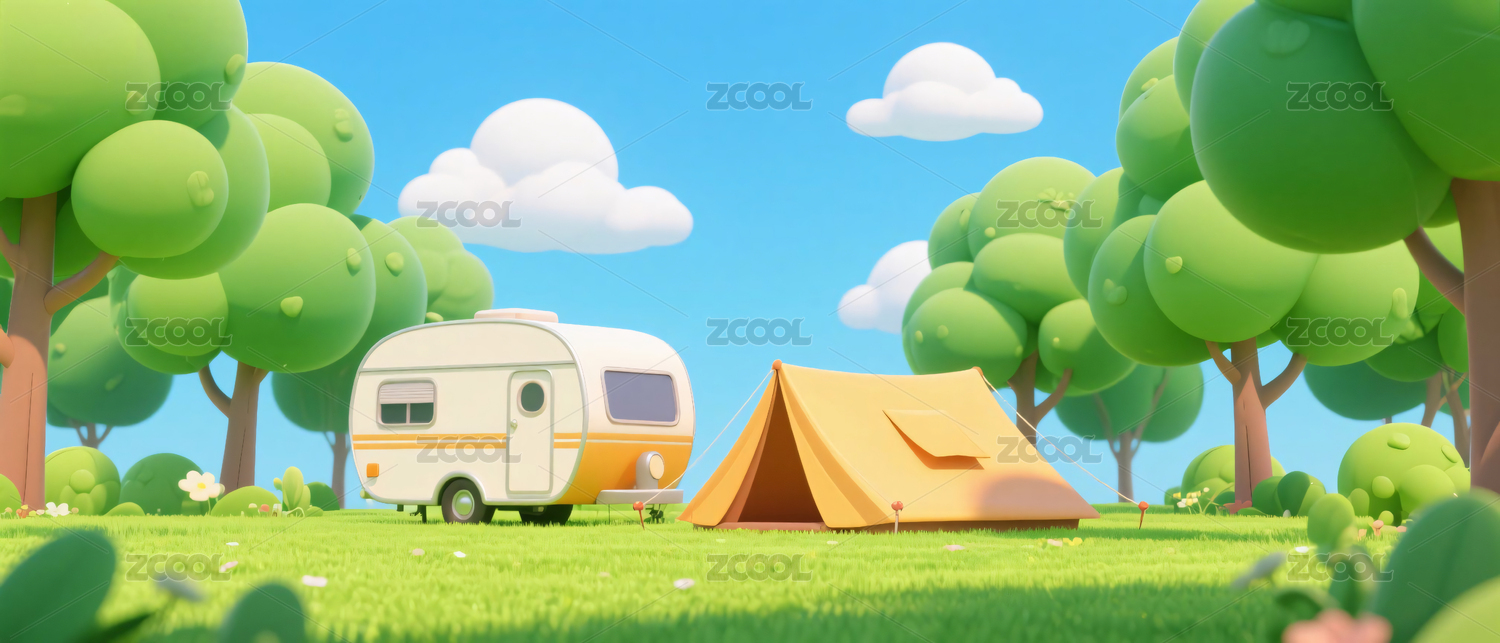 房车,帐篷,树木,花草,卡通,露营,户外,自然,插画,欢乐