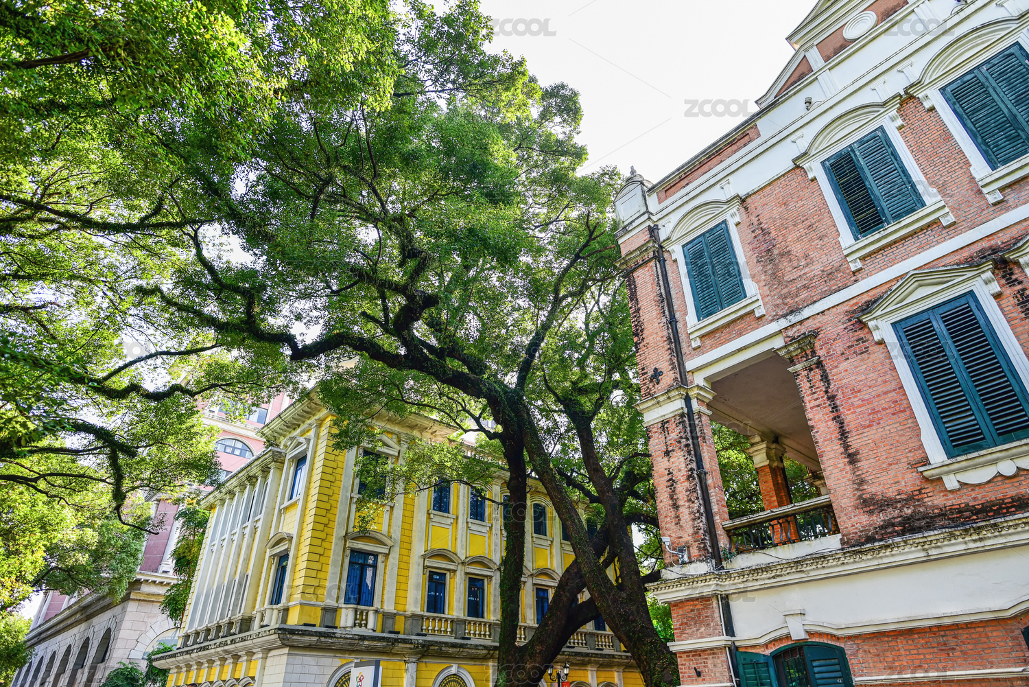 蓝天,白云,绿树,建筑,窗户,树叶,天空,户外,自然,楼房