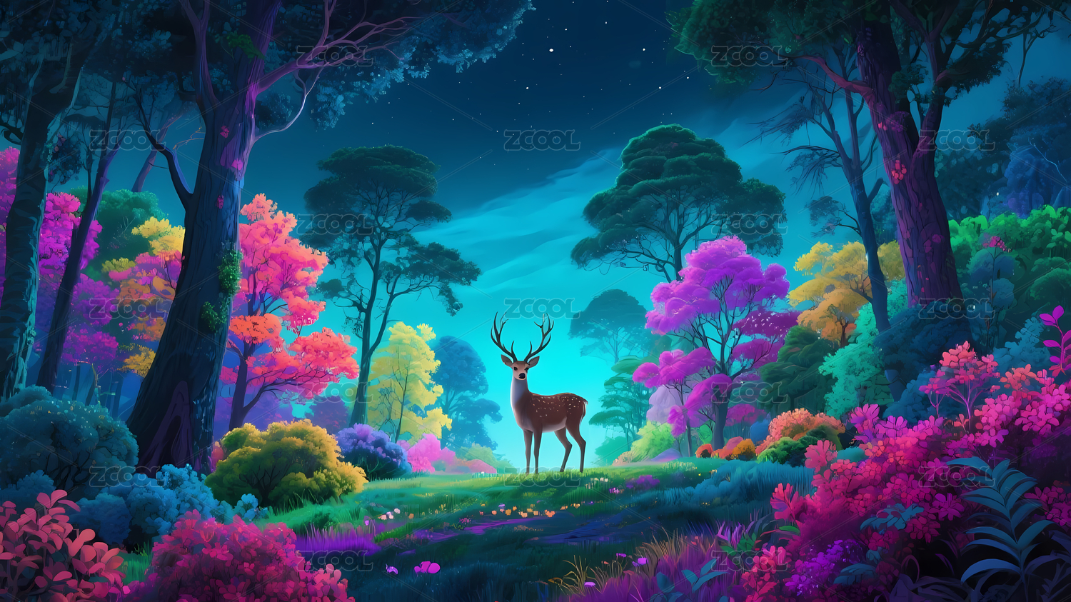 鹿彩色森林夜空星辰