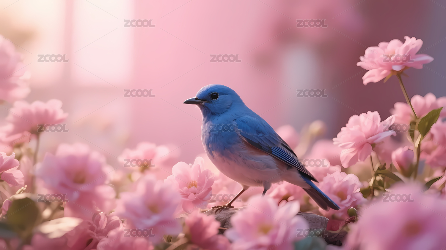 蓝色小鸟与粉色花朵