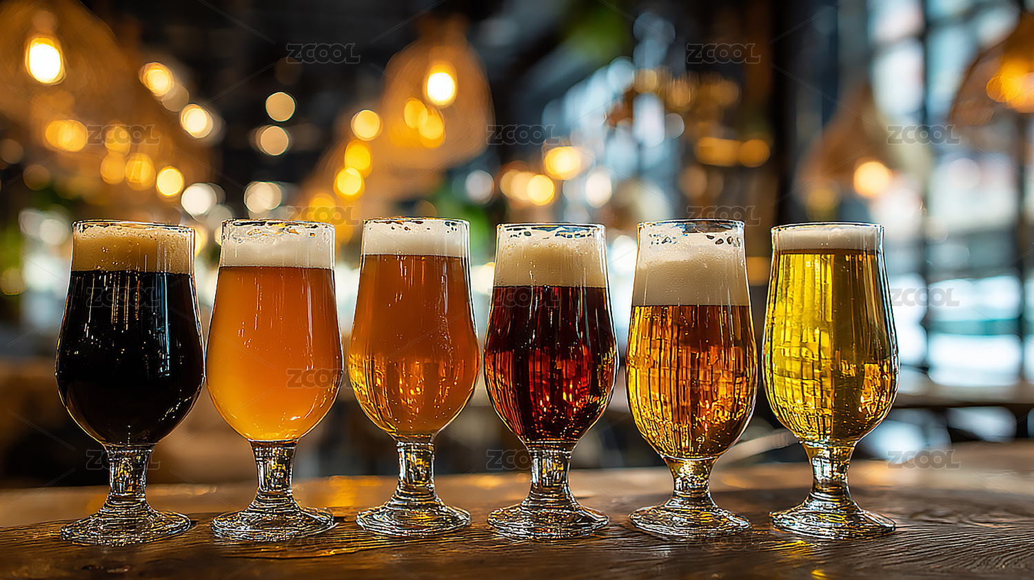棕色桌面上放着一排精酿啤酒