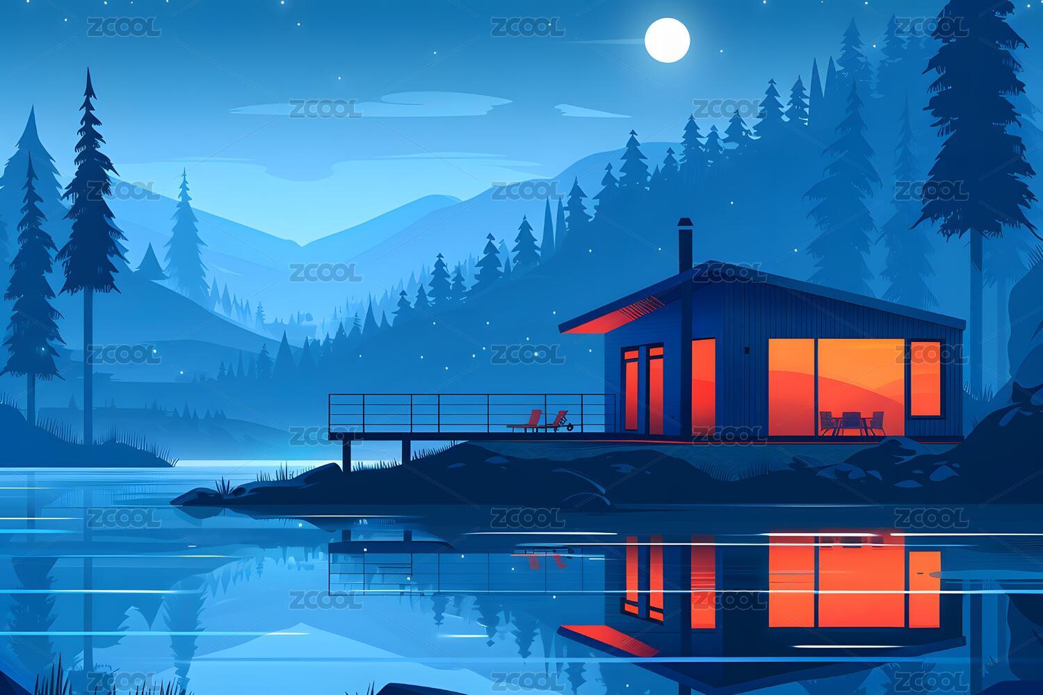 湖畔小屋夜晚风景