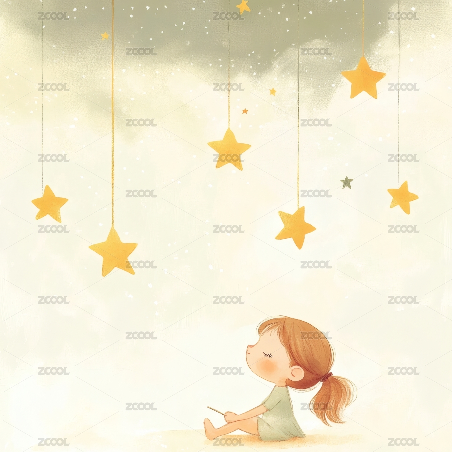 小女孩仰头望悬挂的星星