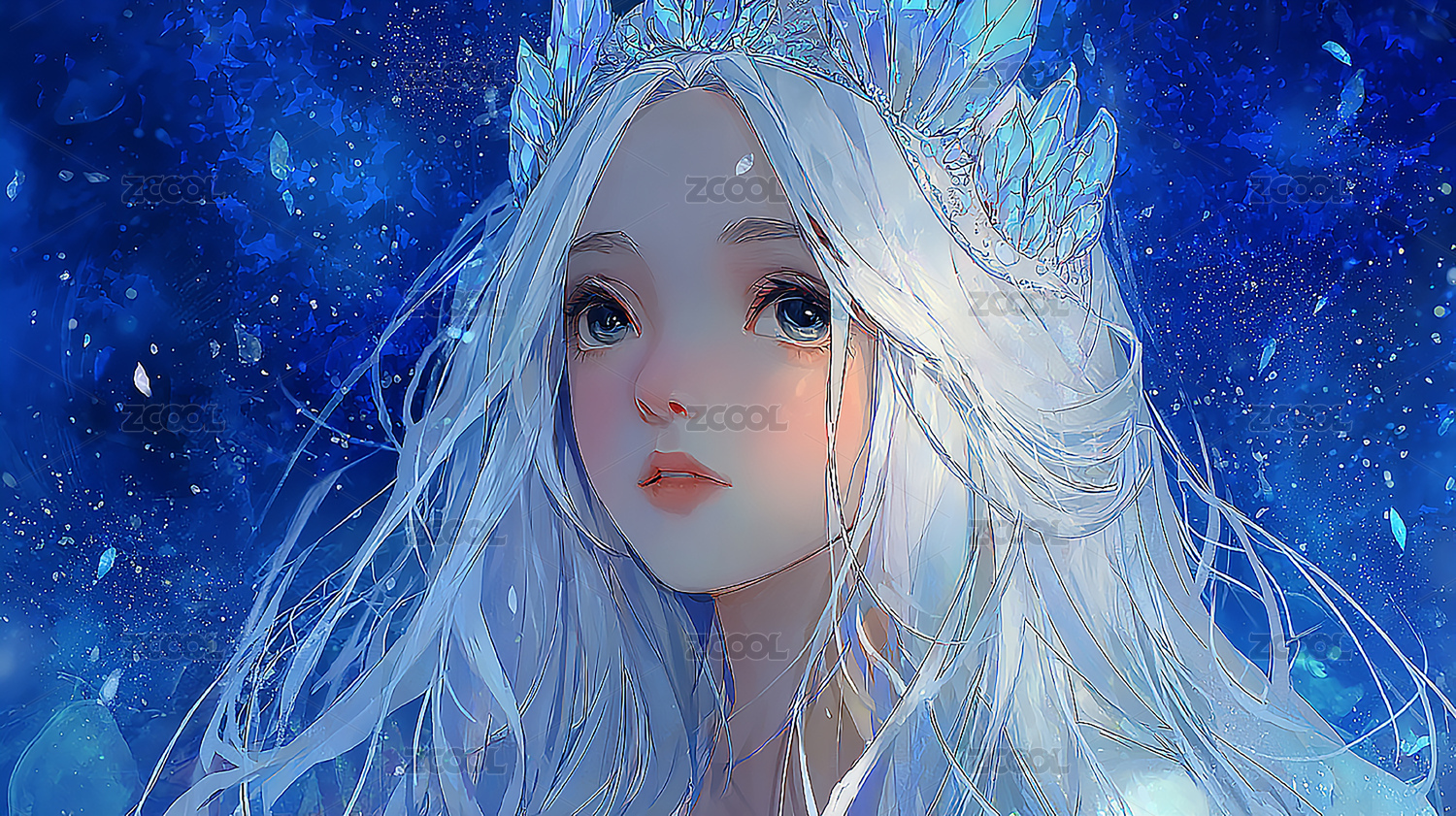 动漫风格,冰雪少女,白色长发,雪花背景,冰晶王冠,蓝色眼睛,幻想角色,冷艳面容