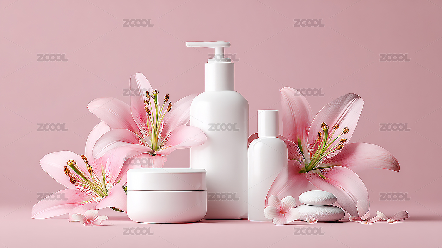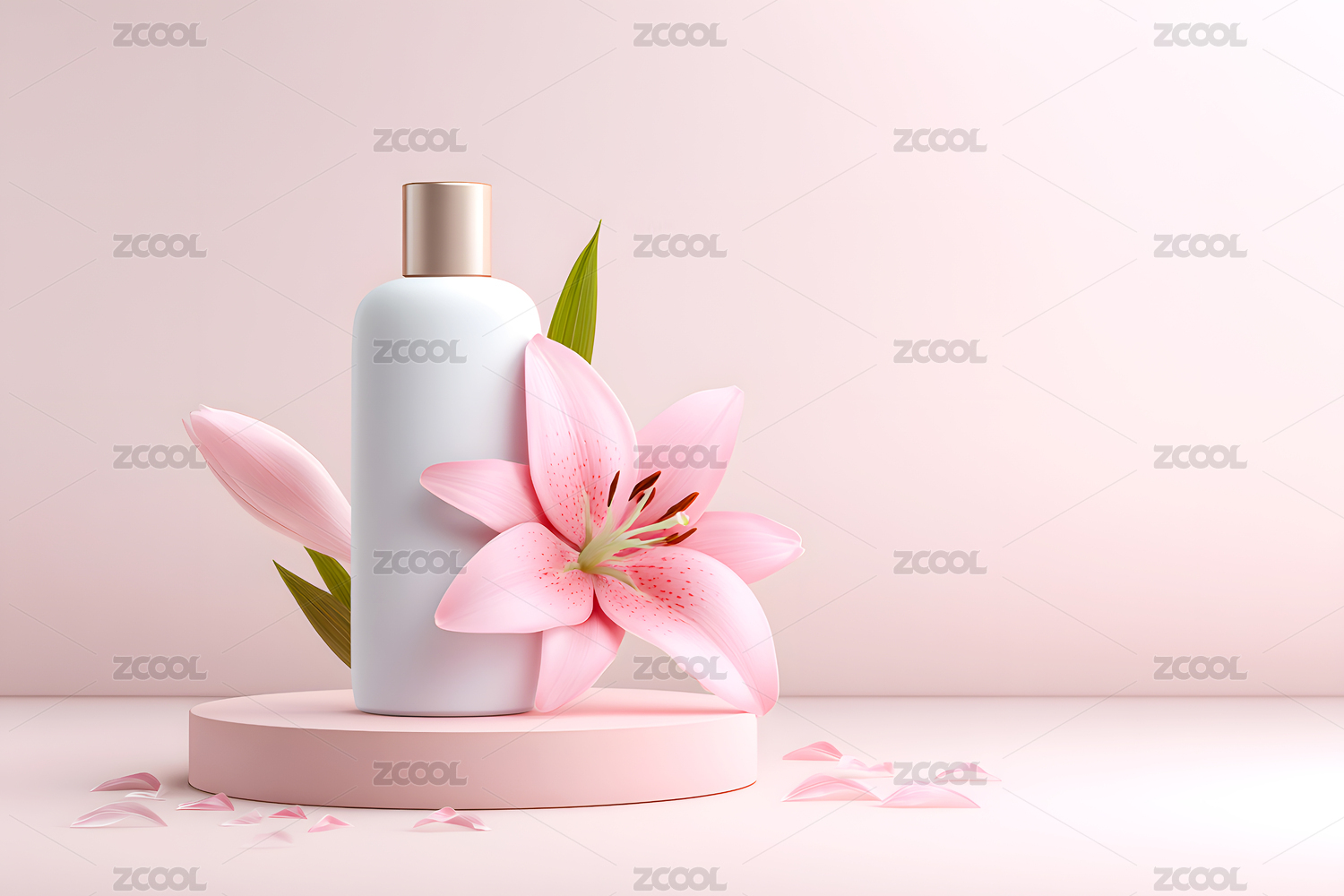 乳液,粉色百合花,绿叶,化妆品瓶,粉色背景,美容护肤,粉色系,优雅,香氛,瓶身设计