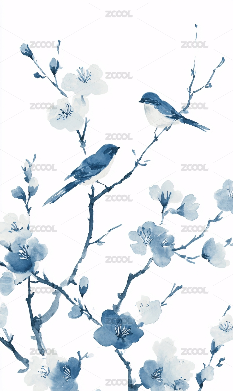 蓝白花鸟插画图案